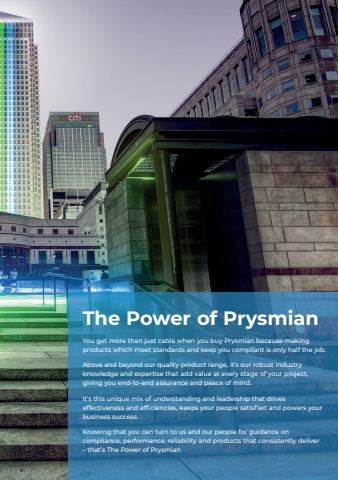 The Power of PrysmianYou get more than just cable when you buy Prysmian because making products which meet standards and keep you compliant is only half the job.Above and beyond our quality product range, it%u2019s our robust industry knowledge and expertise that add value at every stage of your project, giving you end-to-end assurance and peace of mind.It%u2019s this unique mix of understanding and leadership that driveseffectiveness and efficiencies, keeps your people satisfied and powers your business success.Knowing that you can turn to us and our people for guidance oncompliance, performance, reliability and products that consistently deliver%u2013 that%u2019s The Power of Prysmian.