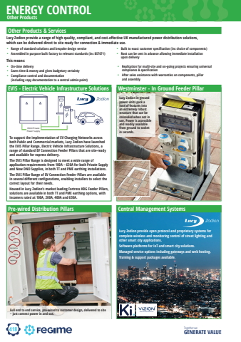 418ENERGY CONTROLTogether we GENERATE VALUEKi VizionOther ProductsEVIS - Electric Vehicle Infrastructure SolutionsOther Products & ServicesLucy Zodion provide a range of high quality, compliant, and cost-eff ective UK manufactured power distribution solutions, which can be delivered direct to site ready for connection & immediate use.%u2022 Range of standard solutions and bespoke design service%u2022 Assembled in purpose built factory to relevant standards (inc BS7671)%u2022 Built to exact customer specification (inc choice of components)%u2022 Root can be sent in advance allowing immediate installation upon delivery%u2022 On-time delivery%u2022 Saves time & money and gives budgetary certainty %u2022 Compliance control and documentation (including copy documentation to a central admin point)%u2022 Replication for multi-site and on-going projects ensuring universal compliance & specification%u2022 After sales assistance with warranties on components, pillar and assemblyThis means:Westminster - In Ground Feeder PillarPre-wired Distribution PillarsLucy Zodion in-ground power units pack a host of features into an extremely robust structure that can be concealed when not in use. Power is accessible and readily available from ground to socket in seconds.Full end to end service, pre-wired to customer design, delivered to site %u2013 just connect power in and out. Central Management SystemsLucy Zodion provide open protocol and proprietary systems for complete wireless and monitoring control of street lighting and other smart city applications.Software platforms for IoT and smart city solutions.Managed service options including gateways and web hosting.Training & support packages available.To support the implementation of EV Charging Networks across both Public and Commercial markets, Lucy Zodion have launched the EVIS Pillar Range, Electric Vehicle Infrastructure Solutions, a range of standard EV Connection Feeder Pillars that are site-ready and available for express delivery. The EVIS Pillar Range is designed to meet a wide range of application requirements from 100A %u2013 630A for both Private Supply and New DNO Supplies, in both TT and PME earthing installations. The EVIS Pillar Range of EV Connection Feeder Pillars are available in several diff erent confi gurations, enabling installers to select the correct layout for their needs. Housed in Lucy Zodion%u2019s market leading Fortress HDG Feeder Pillars, solutions are available in both TT and PME earthing options, with incomers rated at 100A, 200A, 400A and 630A.DNO/Private Power Supply
