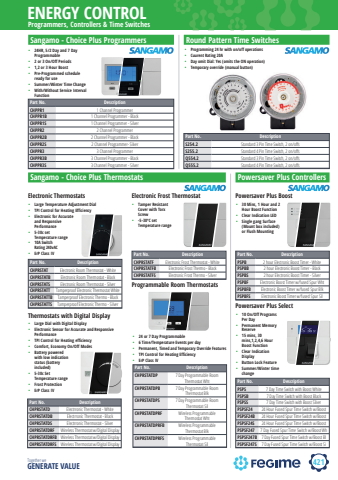 421ENERGY CONTROLTogether we GENERATE VALUEProgrammers, Controllers & Time SwitchesSangamo - Choice Plus ProgrammersSangamo - Choice Plus ThermostatsPart No. DescriptionCHPRSTAT Electronic Room Thermostat - WhiteCHPRSTATB Electronic Room Thermostat - BlackCHPRSTATS Electronic Room Thermostat - SilverCHPRSTATT Tamperproof Electronic Thermostat WhiteCHPRSTATTB Tamperproof Electronic Thermo - BlackCHPRSTATTS Tamperproof Electronic Thermo - SilverElectronic Thermostats%u2022 Large Temperature Adjustment Dial%u2022 TPI Control for Heating EfficiencyPart No. DescriptionCHPRSTATF Electronic Frost Thermostat - WhiteCHPRSTATFB Electronic Frost Thermo - BlackCHPRSTATFS Electronic Frost Thermo - SilverElectronic Frost Thermostat%u2022 Tamper Resistant Cover with Torx Screw%u2022 -5-30%u00baC set Temperature rangeRound Pattern Time SwitchesPart No. DescriptionS254.2 Standard%u00093%u0009Pin%u0009Time%u0009Switch,%u00092%u0009on/off%u0009sS255.2 Standard%u00094%u0009Pin%u0009Time%u0009Switch,%u00092%u0009on/off%u0009sQ554.2 Standard%u00093%u0009Pin%u0009Time%u0009Switch,%u00092%u0009on/off%u0009sQ555.2 Standard%u00094%u0009Pin%u0009Time%u0009Switch,%u00092%u0009on/off%u0009s%u2022 24HR, 5/2 Day and 7 Day Programmable%u2022 2 or 3 On/Off Periods%u2022 1,2 or 3 Hour Boost%u2022 Pre-Programmed schedule ready for use%u2022 Summer/Winter Time Change%u2022 With/Without Service Interval FunctionPart No. DescriptionCHPRSTATD Electrronic Thermostat - WhiteCHPRSTATDB Electrronic Thermostat - BlackCHPRSTATDS Electrronic Thermostat - SilverCHPRSTATDRF Wireless Thermostat w/Digital DisplayCHPRSTATDRFB Wireless Thermostat w/Digital DisplayCHPRSTATDRFS Wireless Thermostat w/Digital DisplayThermostats with Digital Display%u2022 Large Dial with Digital Display%u2022 Electronic Sensor for Accurate and Responsive Performance%u2022 TPI Control for Heating efficiency%u2022 Comfort, Economy On/Off ModesProgrammable Room Thermostats%u2022 24 or 7 Day Programmable%u2022 6 Time/Temperature Events per day%u2022 Permanent, Timed and Temporary Override Features%u2022 TPI Control for Heating Efficiency%u2022 ErP Class IVPart No. DescriptionCHPRSTATDP 7 Day Programmable Room Thermostat WhtCHPRSTATDPB 7 Day Programmable Room Thermostat BlkCHPRSTATDPS 7 Day Programmable Room Thermostat SilCHPRSTATDPRF Wireless Programmable Thermostat WhtCHPRSTATDPRFB Wireless Programmable Thermostat BlkCHPRSTATDPRFS Wireless Programmable Thermostat SilPowersaver Plus ControllersPart No. DescriptionPSPB 2 hour Electronic Boost Timer - WhitePSPBB 2 hour Electronic Boost Timer - BlackPSPBS 2 hour Electronic Boost Timer - SilverPSPBF Electronic Boost Timer w/fused Spur WhtPSPBFB Electronic Boost Timer w/fused Spur BlkPSPBFS Electronic Boost Timer w/fused Spur SilPowersaver Plus Boost%u2022 30 Mins, 1 Hour and 2 Hour Boost Function%u2022 Clear Indication LED%u2022 Single gang Surface (Mount box included)or Flush MountingPart No. DescriptionPSPS 7 Day Time Switch with Boost WhitePSPSB 7 Day Time Switch with Boost BlackPSPSS 7 Day Time Switch with Boost SilverPSPSF24 24 Hour Fused Spur Time Switch w/Boost PSPSF24B 24 Hour Fused Spur Time Switch w/Boost PSPSF24S 24 Hour Fused Spur Time Switch w/Boost PSPSF247 7 Day Fused Spur Time Switch w/Boost WhPSPSF247B 7 Day Fused Spur Time Switch w/Boost BlPSPSF247S 7 Day Fused Spur Time Switch w/Boost SiPowersaver Plus Select%u2022 10 On/Off Programs Per Day%u2022 Permanent Memory Reserve%u2022 15 mins, 30 mins,1,2,4,6 Hour Boost Function%u2022 Clear Indication Display%u2022 Button Lock Feature%u2022 Summer/Winter time change%u2022 Programming 24 hr with on/off operations%u2022 Cuurent Rating 20A %u2022 Day omit Dial: Yes (omits the ON operation)%u2022 Temporary override (manual button)Part No. DescriptionCHPPR1 1 Channel ProgrammerCHPPR1B 1 Channel Programmer - BlackCHPPR1S 1 Channel Programmer - SilverCHPPR2 2 Channel ProgrammerCHPPR2B 2 Channel Programmer - BlackCHPPR2S 2 Channel Programmer- SilverCHPPR3 3 Channel ProgrammerCHPPR3B 3 Channel Programmer - BlackCHPPR3S 3 Channel Programmer - Silver%u2022 Battery powered with low indication status (battery included)%u2022 5-30c Set Temperature range%u2022 Frost Protection%u2022 ErP Class IV%u2022 Electronic for Accurate and Responsive Performance%u2022 5-30c set Temperature range%u2022 10A Switch Rating 240vAC%u2022 ErP Class IV