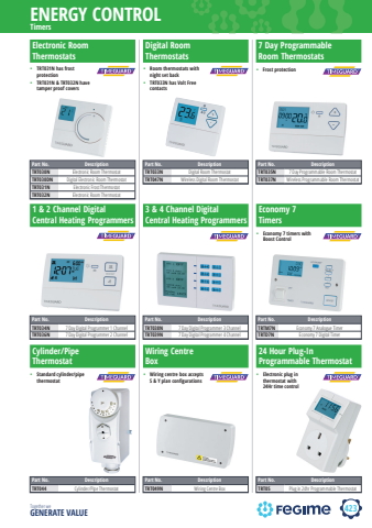 423ENERGY CONTROLTogether we GENERATE VALUEElectronic Room Thermostats %u2022 TRT031N has frost protection%u2022 TRT031N & TRT032N have tamper proof coversPart No. DescriptionTRT030N Electronic Room ThermostatTRT030DN Digital Electronic Room ThermostatTRT031N Electronic Frost ThermostatTRT032N Electronic Room ThermostatDigital Room Thermostats %u2022 Room thermostats with night set back%u2022 TRT033N has Volt Free contactsPart No. DescriptionTRT033N Digital Room ThermostatTRT047N Wireless Digital Room Thermostat7 Day Programmable Room Thermostats %u2022 Frost protection1 & 2 Channel Digital Central Heating Programmers3 & 4 Channel Digital Central Heating ProgrammersEconomy 7 Timers %u2022 Economy 7 timers with Boost ControlCylinder/Pipe Thermostat %u2022 Standard cylinder/pipe thermostatPart No. DescriptionTRT044 Cylinder/Pipe ThermostatWiring Centre Box %u2022 Wiring centre box accepts S & Y plan configurations24 Hour Plug-In Programmable Thermostat Part No. DescriptionTRT049N Wiring Centre BoxPart No. DescriptionTRT05 Plug in 24hr Programmable ThermostatPart No. DescriptionTRT038N 7 Day Digital Programmer 3 ChannelTRT039N 7 Day Digital Programmer 4 ChannelPart No. DescriptionTRTM7N Economy 7 Analogue TimerTRTD7N Economy 7 Digital TimerTimersPart No. DescriptionTRT035N 7 Day Programmable Room ThermostatTRT037N Wireless Programmable Room ThermostatPart No. DescriptionTRT034N 7 Day Digital Programmer 1 ChannelTRT036N 7 Day Digital Programmer 2 Channel%u2022 Electronic plug in thermostat with 24Hr time control
