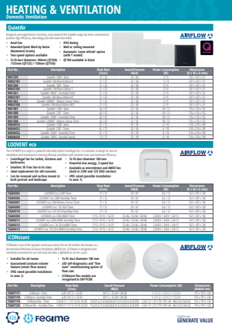 426HEATING & VENTILATIONTogether we GENERATE VALUEairflowDomestic Ventilation%u2022 Axial Fan%u2022 Awarded Quiet Mark by Noise Abatement Society%u2022 Two speed options available%u2022 To fit duct diameters 100mm (QT100)/125mm (QT125) / 150mm (QT150)%u2022 IP45 Rating%u2022 Wall or ceiling mounted%u2022 Automatic %u2018room refresh%u2019 option (with T model)%u2022 QT100 available in blackPart No. Description Flow Rate (l/sec)Sound Pressure dB(A)Power Consumption (W)Dimensions (H x W x D mm)9041259 QuietAir 100B - Basic 21 / 25 25 / 30 5 / 9 147 x 147 x 13190002185 QuietAir 100 Black Edition B 21 / 25 25 / 30 5 / 9 147 x 147 x 1319041260 QuietAir 100T - Timer 21 / 25 25 / 30 5 / 9 147 x 147 x 13190002186 QuietAir 100 Black Edition T 21 / 25 25 / 30 5 / 9 147 x 147 x 1319041261 QuietAir 100HT - Humidity Timer 21 / 25 25 / 30 5 / 9 147 x 147 x 13190002187 QuietAir 100 Black Edition HT 21 / 25 25 / 30 5 / 9 147 x 147 x 1319041262 QuietAir 100MST - Motion Sensor Timer 21 / 25 25 / 30 5 / 9 147 x 147 x 13190002188 QuietAir 100 Black Edition MST 21 / 25 25 / 30 5 / 9 147 x 147 x 1319041497 QuietAir 120B - Basic 42 / 47 32 / 36 10 / 13 176 x 176 x 1559041498 QuietAir 120T - Timer 42 / 47 32 / 36 10 / 13 176 x 176 x 1559041499 QuietAir 120HT - Humidity Timer 42 / 47 32 / 36 10 / 13 176 x 176 x 1559041500 QuietAir 120MST - Motion Sensor Timer 42 / 47 32 / 36 10 / 13 176 x 176 x 15590000454 QuietAir 150B - Basic 61 / 72 35 / 39 6 / 10 210 x 210 x 19090000455 QuietAir 150T - Timer 61 / 72 35 / 39 6 / 10 210 x 210 x 19090000456 QuietAir 150HT - Humidity Timer 61 / 72 35 / 39 6 / 10 210 x 210 x 19090000458 QuietAir 150VS - Variable Speed 13 / 72 35 / 39 6 / 10 210 x 210 x 190QuietAirPart No. Description Flow Rate (l/sec)Sound Pressure dB(A)Power Consumption (W)Dimensions (H x W x D mm)72684305 LOOVENT eco 230V Timer 17 / 31 29 / 47 3.6 / 12 167 x 187 x 13872684306 LOOVENT eco 230V Humidity Timer 17 / 31 29 / 47 3.6 / 12 167 x 187 x 13872684307 LOOVENT eco 230V Motion Sensor Timer 17 / 31 29 / 47 3.6 / 12 167 x 187 x 13872684309 LOOVENT eco 12V SELV Timer 17 / 31 29 / 47 3.6 / 12 167 x 187 x 13872684310 LOOVENT eco 12V SELV Humidity Timer 17 / 31 29 / 47 3.6 / 12 167 x 187 x 13872684308 LOOVENT eco 230V dMEV Timer 7/15 / 9/15 / 16/31 25/46 / 25/46 / 28/46 2.8/8.9 / 3/8.9 / 2.8/12 167 x 187 x 13872684311 LOOVENT eco 230V dMEV Humidity Timer 7/15 / 9/15 / 16/31 25/46 / 25/46 / 28/46 2.8/8.9 / 3/8.9 / 2.8/12 167 x 187 x 13872684312 LOOVENT eco 12V SELV dMEV Timer 7/15 / 9/15 / 16/31 25/46 / 25/46 / 28/46 2.8/8.9 / 3/8.9 / 2.8/12 167 x 187 x 13872684313 LOOVENT eco 12V SELV dMEV Humidity Timer 7/15 / 9/15 / 16/31 25/46 / 25/46 / 28/46 2.8/8.9 / 3/8.9 / 2.8/12 167 x 187 x 138LOOVENT ecoDesigned and engineered in Germany, every detail of the QuietAir range has been constructed to produce high effi ciency, low energy and ultra-low noise levels.%u2022 Centrifugal fan for toilets, kitchens and bathrooms%u2022 Smallest 30 l/sec fan in its class%u2022 Ideal replacement for old Loovents%u2022 Can be recessed and surface mount in both portrait and landscape%u2022 To fit duct diameter 100 mm%u2022 Powerful low energy, 2-speed fan%u2022 Available as intermittent and dMEV fan (both in 230V and 12V SELV version)%u2022 IPX5 rated (possible installation in zone 1)The LOOVENT eco range is a powerful discreetly styled Centrifugal fan. It is modular in design for ease of installation and maintenance ensuring eff ective ventilation with minimal noise and maximum effi ciency.iCONstant%u2022 Suitable for all rooms%u2022 Guaranteed constant volume feature (smart flow sensor)%u2022 IPX5 rated (possible installation in zone 1)%u2022 To fit duct diameter 100 mm%u2022 LED self-diagnostics and %u201cfine tune%u201d commissioning option of flow rate%u2022 iCONstant flex models are recognised in SAP PCDBiCONstant is one of the quietest continuous extract fan on the market. Also known as a decentralised Mechanical Extract Ventilation (dMEV) fan, iCONstant is designed to be extremely economical to run and costs less than a lightbulb to run for a year.Part No. Description Flow Rate (l/sec)Sound Pressure dB(A)Power Consumption (W) Dimensions (HxWxD mm)72687117 iCONstant - Timer 6/8 / 8/13 / 13/20 10/15 / 15/28 / 28/38 1.1/1.2 / 1.2/1.7 / 1.7/2.9 197 x 197 x 12072687118 iCONstant - Humidity Timer 6/8 / 8/13 / 13/20 10/15 / 15/28 / 28/38 1.1/1.2 / 1.2/1.7 / 1.7/2.9 197 x 197 x 12072687119 iCONstant fl ex - Timer 5/8 8/11 1 /13 13/16 16/20 15.4/21.6 21.6/26.8 26.8/31.0 31.0/32.6 32.6/39.9 1.26/1.51 1.51/1.79 1.79/1.96 1.96/2.54 2.54/4.42 197 x 197 x 12072687120 iCONstant fl ex - Humidity Timer 5/8 8/11 11/13 13/16 16/20 15.4/21.6 21.6/26.8 26.8/31.0 31.0/32.6 32.6/39.9 1.26/1.51 1.51/1.79 1.79/1.96 1.96/2.54 2.54/4.42 197 x 197 x 120