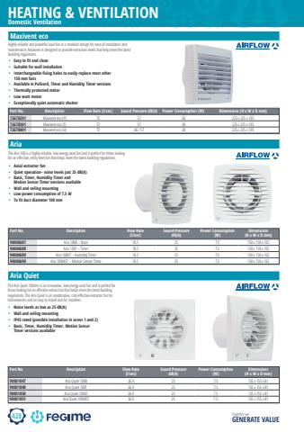428HEATING & VENTILATIONTogether we GENERATE VALUEDomestic VentilationPart No. Description Flow Rate (l/sec)Sound Pressure dB(A)Power Consumption (W)Dimensions (H x W x D mm)90000687 Aria 100B %u2013 Basic 18.5 25 7.5 150 x 150 x 10290000688 Aria 100T %u2013 Timer 18.5 25 7.5 150 x 150 x 10290000689 Aria 100HT %u2013 Humidity Timer 18.5 25 7.5 150 x 150 x 10290000690 Aria 100MST %u2013 Motion Sensor Timer 18.5 25 7.5 150 x 150 x 102Aria%u2022 Axial extractor fan%u2022 Quiet operation%u2013 noise levels just 25 dB(A)%u2022 Basic, Timer, Humidity Timer andMotion Sensor Timer versions available%u2022 Wall and ceiling mounting%u2022 Low power consumption of 7.5 W%u2022 To fit duct diameter 100 mmThe Aria 100 is a highly reliable, low energy axial fan and is perfect for those looking for an eff ective, entry level fan that helps meet the latest building regulations.Part No. Description Flow Rate (l/sec) Sound Pressure dB(A) Power Consumption (W) Dimensions (H x W x D mm)72678201 Maxivent eco (P) 72 57 28 225 x 225 x 10572678301 Maxivent eco (T) 72 57 28 225 x 225 x 10572678401 Maxivent eco (H) 72 46 / 57 28 225 x 225 x 105Maxivent eco%u2022 Easy to fit and clean%u2022 Suitable for wall installation%u2022 Interchangeable fixing holes to easily replace most other 150 mm fans%u2022 Available in Pullcord, Timer and Humidity Timer versions%u2022 Thermally protected motor%u2022 Low watt motor%u2022 Exceptionally quiet automatic shutterHighly reliable and powerful axial fan in a modular design for ease of installation and maintenance. Maxivent is designed to provide extraction levels that help meet the latest building regulations.Part No. Description Flow Rate (l/sec)Sound Pressure dB(A)Power Consumption (W)Dimensions (H x W x D mm)90001047 Aria Quiet 100B 26.9 25 7.5 155 x 155 x 8190001048 Aria Quiet 100T 26.9 25 7.5 155 x 155 x 8190001050 Aria Quiet 100HT 26.9 25 7.5 155 x 155 x 8190001051 Aria Quiet 100MST 26.9 25 7.5 155 x 155 x 81Aria Quiet%u2022 Noise levels as low as 25 dB(A)%u2022 Wall and ceiling mounting%u2022 IP45 rated (possible installation in zones 1 and 2)%u2022 Basic, Timer, Humidity Timer, Motion Sensor Timer versions availableThe Aria Quiet 100mm is an innovative, low energy axial fan and is perfect for those looking for an eff ective extract fan that helps meet the latest building regulations. The Aria Quiet is an unobtrusive, cost-eff ective extractor fan for homeowners and an easy to install unit for installers.