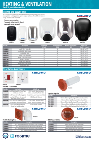 430HEATING & VENTILATIONTogether we GENERATE VALUEPart No. Description Flow Rate (l/sec)Sound Pressure dB(A)Power Consumption (W)Dimensions (H x W x D mm)90000242 ecoDRY 550 %u2013 White ABS 35 68 550 285 x 221 x 15790000243 ecoDRY 550 %u2013 Satin Chrome 35 68 550 285 x 221 x 15790002162 ecoDRY 550 - Black 35 68 550 285 x 221 x 15790000518 ecoDRY 1100 %u2013 White ABS 52 75 1100 285 x 221 x 15790000519 ecoDRY 1100 %u2013 Satin Chrome 52 75 1100 285 x 221 x 15790002163 ecoDRY 1100 - Black 52 75 1100 285 x 221 x 15790000520 ecoDRY mini %u2013 White ABS 31 70 900 238 x 156 x 99.590000521 ecoDRY mini %u2013 Satin Chrome 31 70 900 238 x 156 x 99.590002164 ecoDRY mini - Black 31 70 900 238 x 156 x 99.5ecoDRY and ecoDRY mini%u2022 Low energy consumption%u2022 Very quick drying time (10-20 secs)%u2022 Automatic sensor operatedThe ecoDRY boasts a contemporary design with ergonomic features making it stand out from the competition %u2013 a drying system to aspire to for your washroom. The ecoDRY mini takes on average 20 seconds to dry one%u2019s hands.Ventilation AccessoriesPart No. Description Suitable for90000539 On/Off Switch with Red Neon Power on Indicator and FuseiCON, QuietAir, Maxivent, Aventa In-Line, Aventa Turbo, Aventa Silent90000540 On/Off Switch with Fan Running Symbol Aventa In-Line, Aventa Turbo, Aventa Silent90000541 Low/High/Off Switch with Low and High Speed Running SymbolsiCON, QuietAir, Maxivent90000543 On/Off Switch with Fan Running Symbol and Green Neon Fan Activated IndicatoriCON, QuietAir, Maxivent, Aventa In-Line, Aventa Turbo, Aventa Silent90000547 On/Off Switch with Fan Running Symbol and Lockable IsolatoriCON, QuietAir, MaxiventPart No. Description72643601 3m x 100mm Flexible Ducting with Square Grille %u2013 Terracotta 72643602 3m x 100mm Flexible Ducting with Square Grille %u2013 White 72643603 3m x 150mm Flexible Ducting with Square Grille %u2013 Terracotta 72643604 3m x 150mm Flexible Ducting with Part No. Description72596201 100mm Diameter Terracotta Round Grille 72596202 100mm Diameter White Round Grille 72593101 150mm Diameter Terracotta Round Grille 72593102 150mm Diameter White Round Grille Part No. Description72643201 100mm x 350mm Rigid Ducting with Terracotta Round Grille 72643202 100mm x 350mm Rigid Ducting with White Round Grille 72643203 150mm x 350mm Rigid Ducting with Terracotta Round Grille 72643204 150mm x 350mm Rigid Ducting with White Round Grille 9021451 100mm x 330mm Rigid Ducting with Cowl and Rubber Seal iCON Round GrillesRigit Ducting KitsFlexible Ducting KitsSwitches & Controllers90000520 90000521 90000242 9000051990000539 90000541726436017264320172596201Hand Dryers & Accessories90002164 90002163