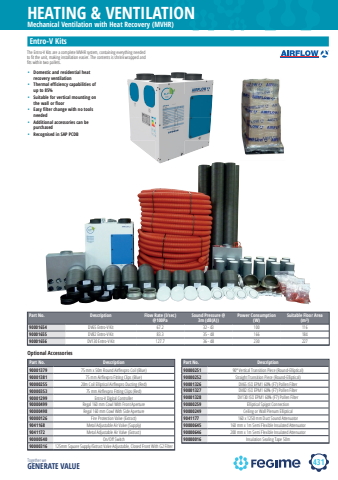 431HEATING & VENTILATIONTogether we GENERATE VALUEPart No. Description Flow Rate (l/sec) @100PaSound Pressure @ 3m (dB(A))Power Consumption (W)Suitable Floor Area (m%u00b2)90001654 DV65 Entro-V Kit 67.2 32 - 43 100 11690001655 DV82 Entro-V Kit 83.3 35 - 48 166 18490001656 DV130 Entro-V Kit 127.7 36 - 48 230 227Entro-V KitsThe Entro-V Kits are a complete MVHR system, containing everything needed to fi t the unit, making installation easier. The contents is shrink wrapped and fi ts within two pallets.Part No. Description90001379 75 mm x 50m Round Airfl expro Coil (Blue)90001381 75 mm Airfl expro Fitting Clips (Blue)90000255 20m Coil Elliptical Airfl expro Ducting (Red)90000353 75 mm Airfl expro Fitting Clips (Red)90001299 Entro-V Digital Controller90000499 Regal 160 mm Cowl With Front Aperture90000498 Regal 160 mm Cowl With Side Aperture90000126 Fire Protection Valve (Extract)9041168 Metal Adjustable Air Valve (Supply)9041172 Metal Adjustable Air Valve (Extract)90000540 On/Off Switch90000316 125mm Square Supply/Extract Valve Adjustable, Closed Front With G2 FilterOptional AccessoriesPart No. Description90000251 90%u00ba Vertical Transition Piece (Round-Elliptical)90000252 Straight Transition Piece (Round-Elliptical)90001326 DV65 ISO EPM1 60% (F7) Pollen Filter90001327 DV82 ISO EPM1 60% (F7) Pollen Filter90001328 DV130 ISO EPM1 60% (F7) Pollen Filter90000259 Elliptical Spigot Connection90000249 Ceiling or Wall Plenum Elliptical9041177 160 x 1250 mm Duct Sound Attenuator90000645 160 mm x 1m Semi Flexible Insulated Attenuator90000646 200 mm x 1m Semi Flexible Insulated Attenuator90000016 Insulation Sealing Tape 50m%u2022 Domestic and residential heat recovery ventilation %u2022 Thermal efficiency capabilities of up to 85%%u2022 Suitable for vertical mounting on the wall or floor %u2022 Easy filter change with no tools needed%u2022 Additional accessories can be purchased%u2022 Recognised in SAP PCDBMechanical Ventilation with Heat Recovery (MVHR)