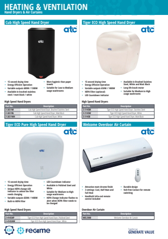 434HEATING & VENTILATIONTogether we GENERATE VALUEHand Dryers & Air CurtainsCub High Speed Hand Dryer%u2022 15 second drying time%u2022 Energy Efficient Operation%u2022 Variable outputs 600W / 1300W %u2022 Available in brushed stainless steel / matt black / white%u2022 More hygienic than paper towels%u2022 Suitable for Low to Medium usage washroomsHigh Speed Hand DryersPart No. DescriptionZ-2651M Cub High Speed Hand Dryer, Brushed Stainless SteelZ-2651BL Cub High Speed Hand Dryer, Matt BlackZ-2651WH Cub High Speed Hand Dryer, WhiteTiger ECO High Speed Hand Dryer%u2022 15 second drying time%u2022 Energy Efficient Operation%u2022 Variable outputs 650W / 1400W%u2022 HEPA Filter (optional)%u2022 LED Countdown Indicator%u2022 Available in Brushed Stainless Steel, White and Matt Black%u2022 Long life brush motor%u2022 Suitable for Medium to High usage washroomsHigh Speed Hand DryersPart No. DescriptionZ-3145M Tiger ECO High Speed Hand Dryer, Stainless SteelZ-3145W Tiger ECO High Speed Hand Dryer, WhiteZ-3145B Tiger ECO High Speed Hand Dryer, Matt BlackTiger ECO Pure High Speed Hand Dryer%u2022 15 second drying time%u2022 Energy Efficient Operation%u2022 Unique HEPA change LED indicator to advise the filter needs changing%u2022 Variable outputs 650W / 1400W%u2022 Built-in HEPA Filter%u2022 LED Countdown Indicator%u2022 Available in Polished Steel and White%u2022 Suitable for Medium to High usage washrooms%u2022 HEPA Change Indicator flashes to alert when HEPA Filter needs to be changedHigh Speed Hand DryersPart No. DescriptionZ-4145HP Tiger ECO Pure High Speed Hand Dryer, Polished SteelZ-4145HW Tiger ECO Pure High Speed Hand Dryer, WhiteWelcome Overdoor Air Curtain%u2022 Attractive matt chrome finish%u2022 3 settings: Cool, Half Heat and Full Heat%u2022 Handheld infra-red remote control included%u2022 Durable design%u2022 Volt-free Contact for remote switchingOverdoor Air CurtainPart No. DescriptionWEL3000 Welcome Overdoor Air Curtain