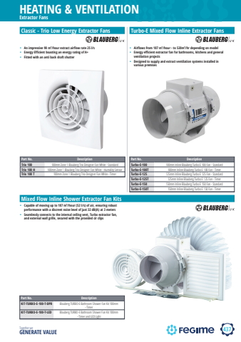 437HEATING & VENTILATIONTogether we GENERATE VALUEExtractor FansPart No. DescriptionTrio 100 100mm Zone 1 Blauberg Trio Designer Fan White - StandardTrio 100 H 100mm Zone 1 Blauberg Trio Designer Fan White - Humidity SensorTrio 100 T 100mm Zone 1 Blauberg Trio Designer Fan White - TimerClassic - Trio Low Energy Extractor Fans%u2022 An impressive 90 m3/hour extract airflow rate 25 l/s%u2022 Energy Efficient boasting an energy rating of A+%u2022 Fitted with an anti back draft shutterPart No. DescriptionKIT-TURBO-E-100-T-DPR Blauberg TURBO-E Bathroom Shower Fan Kit 100mm - TimerKIT-TURBO-E-100-T-LED Blauberg TURBO-E Bathroom Shower Fan Kit 100mm - Timer and LED LightMixed Flow Inline Shower Extractor Fan Kits%u2022 Capable of moving up to 187 m3/hour (52 l/s) of air, ensuring robust performance with a discreet noise level of just 32 dB(A) at 3 meters%u2022 Seamlessly connects to the internal ceiling vent, Turbo extractor fan, and external wall grille, secured with the provided cir clipsPart No. DescriptionTurbo-E-100 100mm Inline Blauberg Turbo E 100 Fan - StandardTurbo-E-100T 100mm Inline Blauberg Turbo E 100 Fan - TimerTurbo-E-125 125mm Inline Blauberg Turbo E 125 Fan - StandardTurbo-E-125T 125mm Inline Blauberg Turbo E 125 Fan - TimerTurbo-E-150 150mm Inline Blauberg Turbo E 150 Fan - StandardTurbo-E-150T 150mm Inline Blauberg Turbo E 150 Fan - TimerTurbo-E Mixed Flow Inline Extractor Fans%u2022 Airflows from 187 m3/hour - to 520m3/hr depending on model %u2022 Energy efficient extractor fan for bathrooms, kitchens and general ventilation projects%u2022 Designed to supply and extract ventilation systems installed in various premises