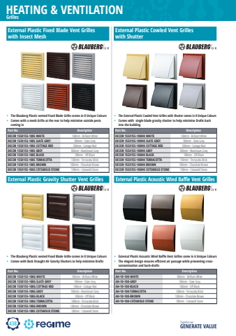 438HEATING & VENTILATIONTogether we GENERATE VALUEGrillesPart No. DescriptionDECOR 155X155-100S WHITE 100mm - Brilliant WhiteDECOR 155X155-100S SLATE GREY 100mm - Slate GreyDECOR 155X155-100S COTTAGE RED 100mm - Cottage RedDECOR 155X155-100S GREY 100mm - Aluminium GreyDECOR 155X155-100S BLACK 100mm - Off Black DECOR 155X155-100S TERRACOTTA 100mm - Terracotta Brick DECOR 155X155-100S BROWN 100mm - Chocolate BrownDECOR 155X155-100S COTSWOLD STONE 100mm - Cotswold StoneExternal Plastic Fixed Blade Vent Grilles with Insect Mesh%u2022 The Blauberg Plastic vented Fixed Blade Grille comes in 8 Unique Colours%u2022 Comes with a mesh Grille at the rear to help minimise outside pests coming inExternal Plastic Gravity Shutter Vent Grilles%u2022 The Blauberg Plastic vented Fixed Blade Grille comes in 8 Unique Colours%u2022 Comes with Back Draught Air Gravity Shutters to help minimise Drafts%u2022 The External Plastic Cowled Vent Grilles with Shutter comes in 8 Unique Colours%u2022 Comes with single blade gravity shutter to help minimise Drafts back into the buildingExternal Plastic Acoustic Wind Baffle Vent Grilles%u2022 External Plastic Acoustic Wind Baffle Vent Grilles come in 6 Unique Colours%u2022 The elegant design ensures efficient air passage while preventing crosscontamination and back-draftsExternal Plastic Cowled Vent Grilles with ShutterPart No. DescriptionDECOR 155X155-100HK WHITE 100mm - Brilliant WhiteDECOR 155X155-100HK SLATE GREY 100mm - Slate GreyDECOR 155X155-100HK COTTAGE RED 100mm - Cottage RedDECOR 155X155-100HK GREY 100mm - Aluminium GreyDECOR 155X155-100HK BLACK 100mm - Off BlackDECOR 155X155-100HK TERRACOTTA 100mm - Terracotta BrickDECOR 155X155-100HK BROWN 100mm - Chocolate BrownDECOR 155X155-100HK COTSWOLD STONE 100mm - Cotswold StonePart No. DescriptionDECOR 155X155-100G WHITE 100mm - Brilliant WhiteDECOR 155X155-100G SLATE GREY 100mm - Slate GreyDECOR 155X155-100G COTTAGE RED 100mm - Cottage RedDECOR 155X155-100G GREY 100mm - Aluminium GreyDECOR 155X155-100G BLACK 100mm - Off BlackDECOR 155X155-100G TERRACOTTA 100mm - Terracotta BrickDECOR 155X155-100G BROWN 100mm - Chocolate BrownDECOR 155X155-100S COTSWOLD STONE 100mm - Cotswold StonePart No. DescriptionAH-10-100-WHITE 100mm - Brilliant WhiteAH-10-100-GREY 100mm - Slate GreyAH-10-100-BLACK 100mm - Off BlackAH-10-100-TERRACOTTA 100mm - Terracotta BrickAH-10-100-BROWN 100mm - Chocolate BrownAH-10-100-COTSWOLD STONE 100mm - Cotswold Stone