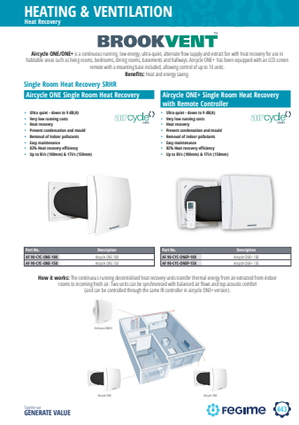 443HEATING & VENTILATIONTogether we GENERATE VALUEHeat Recovery%u2022 Ultra quiet - down to 9 dB(A)%u2022 Very low running costs%u2022 Heat recovery%u2022 Prevent condensation and mould%u2022 Removal of indoor pollutants%u2022 Easy maintenance%u2022 82% Heat recovery efficiency%u2022 Up to 8l/s (100mm) & 17l/s (150mm)Aircycle ONE/ONE+ is a continuous running, low energy, ultra-quiet, alternate fl ow supply and extract fan with heat recovery for use in habitable areas such as living rooms, bedrooms, dining rooms, basements and hallways. Aircycle ONE+ has been equipped with an LCD screen remote with a mounting base included, allowing control of up to 10 units.Benefi ts: Heat and energy saving.Aircycle ONE Single Room Heat Recovery%u2022 Ultra quiet - down to 9 dB(A)%u2022 Very low running costs%u2022 Heat recovery%u2022 Prevent condensation and mould%u2022 Removal of indoor pollutants%u2022 Easy maintenance%u2022 82% Heat recovery efficiency%u2022 Up to 8l/s (100mm) & 17l/s (150mm)Part No. DescriptionAF 90-CYC-ONE-100 Aircycle ONE 100AF 90-CYC-ONE-150 Aircycle ONE 150Aircycle ONE+ Single Room Heat Recovery with Remote ControllerSingle Room Heat Recovery SRHRPart No. DescriptionAF 90-CYC-ONEP-100 Aircycle ONE+ 100AF 90-CYC-ONEP-150 Aircycle ONE+ 150How it works: The continuous running decentralised heat recovery units transfer thermal energy from air extracted from indoor rooms to incoming fresh air. Two units can be synchronised with balanced air fl ows and top acoustic comfort (and can be controlled through the same IR controller in aircycle ONE+ version). AirStream DMEVAircycle ONE Aircycle ONE