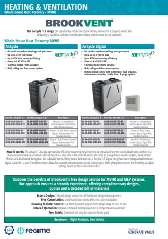444HEATING & VENTILATIONTogether we GENERATE VALUEWhole House Heat Recovery - MVHR%u2022 For small to medium dwellings and apartments%u2022 Up to 65 l/s @ 150 Pa max %u2022 Up to 92% heat recovery efficiency%u2022 Down to 0.42 W/l/s SFP%u2022 4 Airflow modes (100% variable)%u2022 Wall, ceiling and floor mount options%u2022 Remote digital control with night mode, fault indicator, maintenance reminder, trickle, boost & purge optionsThe aircycle 1.3 range can signifi cantly reduce the space heating demand of a property whilst also delivering a healthier and more comfortable indoor environment for the occupier.AirCycle%u2022 For small to medium dwellings and apartments%u2022 Up to 65 l/s @ 150 Pa max %u2022 Up to 92% heat recovery efficiency%u2022 Down to 0.42 W/l/s SFP%u2022 4 Airflow modes (100% variable)%u2022 Wall, ceiling and floor mount optionsPart No. Aircycle 1.3 Part No. Aircycle 1.3+ DescriptionAS 90-0103-CINS-01AS 90-0103-CINS-01VAS 90-0103P-CINS-01AS 90-0103P-CINS-01VAircycle 1.3, Ceiling Mount, Summer Bypass, Potentiometer PCB, Standard/InvertedAS 90-0103-FINS-01AS 90-0103-FINS-01VAS 90-0103P-FINS-01AS 90-0103P-FINS-01VAircycle 1.3, Floor Mount, Summer Bypass, Potentiometer PCB, Standard/InvertedAS 90-0103-WINS-01AS 90-0103-WINS-01V AS 90-0103P-WINS-01AS 90-0103P-WINS-01V Aircycle 1.3, Wall Mount, Summer Bypass, Potentiometer PCB, Standard/InvertedAirCycle DigitalWhole House Heat Recovery MVHRPart No. Aircycle 1.3 Part No. Aircycle 1.3+ DescriptionAS 90-0103-CDS-01AS 90-0103-CDS-01VAS 90-0103P-CDS-01AS 90-0103P-CDS-01VAircycle 1.3, Ceiling Mount, Summer Bypass, Digital PCB, Standard/InvertedAS 90-0103-FDS-01AS 90-0103-FDS-01VAS 90-0103P-FDS-01AS 90-0103P-FDS-01VAircycle 1.3, Floor Mount, Summer Bypass, Digital PCB, Standard/InvertedAS 90-0103-WDS-01AS 90-0103-WDS-01VAS 90-0103P-WDS-01AS 90-0103P-WDS-01VAircycle 1.3, Wall Mount, Summer Bypass, Digital PCB, Standard/InvertedHow it works: The aircycle 1.3 range operates by effi ciently recovering heat from the air extracted from wet rooms (bathroom, kitchen etc.) that would normally be expelled to the atmosphere. This heat is then transferred to the fresh air being drawn into the system, which is then fi ltered and distributed throughout the habitable rooms (living room, bedroom etc.). Aircycle 1.3 Digital range has been equipped with remote digital controller, a user friendly interface allows for bespoke commissioning to suit each project, while giving the end user the fl exibility to adjust settings based on their individual needs.Discover the benefi ts of Brookvent%u2019s free design service for MVHR and MEV systems. Our approach ensures a smooth experience, off ering complimentary designs, quotes and a detailed bill of materialsExpert Design: Tailored design service for self-build and design & build projectsFree Consultation: Understand your needs with a no-cost consultationDrawing to Order Service: Our team provides support from design stage to start on siteDetailed Quotation: Receive a detailed ducting layout and a comprehensive quotationFree Guide: Download our step-by-step ventilation guideBrookvent %u2013 Right Products, Best Advice