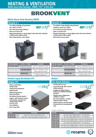 445HEATING & VENTILATIONTogether we GENERATE VALUE%u2022 For medium to large dwellings and apartments %u2022 Suitable for houses up to 285m%u00b2%u2022 Up to 93% heat recovery efficiency %u2022 Down to 0.43 W/l/s SFP%u2022 Manual potentiometer or remote digital control with status indication %u2022 4 Airflow modes (100% variable)%u2022 Wall and floor mount options%u2022 For medium dwellings and apartments%u2022 Up to 100 l/s at 160 Pa %u2022 Up to 93% heat recovery efficiency%u2022 Down to 0.41 W/l/s SFP%u2022 Manual potentiometer or remote digital control with status indication %u2022 4 Airflow modes (100% variable)%u2022 Wall, ceiling and floor mount options%u2022 Reduces condensation%u2022 Energy savings%u2022 Improved heat distribution%u2022 Health benefits%u2022 Minimum maintenance%u2022 Quiet and efficient%u2022 No additional ducting required %u2022 Integral, multi-functional controls: 10 fan speeds, automatic heat recovery mode, summer stand-by mode%u2022 Easy installation %u2022 Up to 10 year filterWhole House Heat Recovery - MVHR / PIV / In-line FansAircycle 3.1Airplus PIVPart No. DescriptionAF 90-AP-STD Airplus LOFT - Positive Input Ventilation SystemAF 90-AP-EHB Airplus LOFT - Positive Input Ventilation System w/ HeaterAircycle 4.1Whole House Heat Recovery MVHRPositive Input Ventilation PIVPart No. Aircycle 3.1 Part No. 3.1 Digital DescriptionAS 90-0301-WINS-01 Aircycle 3.1, Wall Mount, Summer Bypass, Potentiometer PCB, StandardAS 90-0301-WDS-01 Aircycle 3.1, Wall Mount, Summer Bypass, Digital PCB, StandardAM 90-02-301 Aircycle Digital Controller - Required for Digital PCB MVHR UnitsPart No. Aircycle 4.1 Part No. 4.1 Digital DescriptionAS 90-0401-WINS-01 Aircycle 4.1, Wall Mount, Summer Bypass, Potentiometer PCB, StandardAS 90-0401-WDS-01 Aircycle 4.1, Wall Mount, Summer Bypass, Digital PCB StandardAM 90-02-301 Aircycle Digital Controller - Required for Digital PCB MVHR Units%u2022 Provides 90% Free Area%u2022 Low profile design offers minimal airflow resistance%u2022 Available for 204x60 (Single & Double) and 220x90mm (double) Ductwork%u2022 Bespoke sleeve configurations available on request%u2022 RAL Colour Matching %u2013 A2 Rated Polyester Powder Coating%u2022 Optional Bezel for non-brick fa%u00e7ade%u2022 Constructed from 1mm galvanized steelFire Rated AirbricksAirductPart No. DescriptionAF204-09-008 204 x 60mm Single FIREBRICK 400mm L - RAL 9010 (White)AF204-09-003 204 x 60mm Single FIREBRICK 400mm L - RAL 9005 (Black)AF204-09-013 204 x 60mm Single FIREBRICK 400mm L with Bezel - RAL 9010 (White)AF204-09-004 204 x 60mm Single FIREBRICK 400mm L with Bezel - RAL 9005 (Black)AF220-09-001 220 x 90mm Double FIREBRICK 600mm L - RAL 9005 (Black)AF220-09-008 220 x 90mm Double FIREBRICK 600mm L with Bezel - RAL 9010 (White)AF220-09-002 220 x 90mm Double FIREBRICK 600mm L with Bezel - RAL 9005 (Black)*Available in any RAL colour