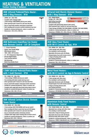 448HEATING & VENTILATIONTogether we GENERATE VALUE%u2022 2000W, 220 - 240v~50Hz%u2022 Complete with 2 Halogen tubes%u2022 2 Heat settings (1000/2000W) with tip over switch%u2022 Silent operation with %u2018Instant On%u2019 and even heat flow%u2022 Easy to install with stainless steel pipes & stand base%u2022 Floor standing with corrosion resistant aluminium top cover%u2022 Suitable for commercial/domestic, indoor or outdoor use%u2022 Dimensions:- 610 x 610 x 2100 mmPart No. DescriptionHTIR2PD 2kW infrared Pedestal/Patio Heater%u2022 1 - 8 Hours Operation%u2022 Stylish, Clean Simple Design%u2022 With Remote Control%u2022 1400 / 2000 / OFF Function%u2022 15 - 35%u00b0C Temperature Adjustment%u2022 Discreet Digital Display%u2022 Touch Sensitive Buttons%u2022 Wall Mounting%u2022 Made from durable PlasticPart No. DescriptionHTPN15 1.5kW Aluminium Body Panel Heaters - with Remote ControlHTPN18 1.8kW Aluminium Body Panel Heaters - with Remote ControlOutdoor Heating & Radiators2kW Infrared Pedestal/Patio Heater -with 2 Ring Element - IP342kW Bathroom Downflow Fan Heaterwith Remote Control - LOT 20 CompliantPart No. DescriptionHTB2PTC 2kW Round Bathroom Dowfl ow PTC HeaterPart No. DescriptionHTIR2TW 2kW Infrared Carbon Eletric Element Tower Heater%u2022 P34, 1500W, 220 - 240v~50Hz%u2022 1 Heat settings (1500W) with tip over switch%u2022 Free standing with black coated steel top cover%u2022 Silent operation with %u2018Instant On%u2019 and even heat flow%u2022 Easy to install with stainless steel pipes & black stand base%u2022 Suitable for commercial/domestic, indoor or outdoor use%u2022 Complete with single gold tube & pull-string switch control%u2022 Suitable for commercial/domestic, indoor or outdoor use%u2022 Dimensions: 560 x 540 x 375 mm1.5kW Infrared Pedestal/Patio Heater -with 1 Gold Element - IP34Part No. DescriptionHTIR15PD 1.5kW Infrared Pedestal/Patio Heater%u2022 IP34, 2000W, 220 - 240v~50Hz%u2022 3 Heat settings (650/1350/2000W) with tip over switch%u2022 Floor standing with black coated steel top and LED display%u2022 Silent operation with %u2018Instant On%u2019 and even heat flow%u2022 Easy to install with stainless steel body and base%u2022 Complete with single carbon heating tube & remote control%u2022 Suitable for commercial/domestic, indoor or outdoor use%u2022 Dimensions:305 x 305 x 1250 mm2kW Infrared Carbon Electric Element Tower Heater%u2022 IP55, 2000W/2800W%u2022 Voltage: 220 - 240v~50Hz%u2022 Wall/ceiling mountablewith aluminium body%u2022 Complete with gold heating element with control%u2022 Silent operation with %u2018Instant On%u2019 and even heat flow%u2022 3 Heat settings (HTIR2WL:750/1500/2000W), (HTIR3WL: 950/1400/2800W)%u2022 Suitable for commercial/domestic, indoor or outdoor use%u2022 Dimensions: HTIR2WL: 675 x 180 x 150 mm / HTIR3WL: 1000 x 180 x 150 mmInfrared Gold Electric Element Heaters -with 2 Ring Element - IP34Part No. DescriptionHTIR2WL 2kW Infrared Gold Eletric Element HeaterHTIR3WL 3kW Infrared Gold Eletric Element Heater%u2022 IP24, 2000W, 220 - 240v~50Hz%u2022 2 Heat settings with 24hrs timer%u2022 Free standing or wall mountable%u2022 Adjustable thermostat with LED display%u2022 Tempered glass front with remote control%u2022 X-shape al heating element withover heating protection%u2022 Suitable for commercial/domestic, indoor or outdoor use%u2022 Dimensions: 965 x 130 x 470 mm2kW Glass Panel Heater -with Wi-Fi Control via App, IP24Part No. DescriptionHPGS2BKSM 2kW Glass Panel Heater with Wi-Fi control, IP24%u2022 IP24, 2000W, 220 - 240v~50Hz%u2022 2 Heat settings with 24hrs timer%u2022 Free standing or wall mountable%u2022 Adjustable thermostat with LED display%u2022 Tempered glass front with remote control%u2022 X-shape al heating element withover heating protection%u2022 Suitable for commercial/domestic, indoor or outdoor use%u2022 Dimensions: HP15WHSM: 805x130x470 mm / HP2WHSM: 965x130x470 mmMetal Panel Heaters - with Wi-Fi Control via App & Remote ControlPart No. DescriptionHP15WHSM 1.5kW Metal Panel Heater with Wi-Fi & Remote ctrl, IP24HP2WHSM 2kW Metal Panel Heater with Wi-Fi & Remote ctrl, IP24%u2022 IP24, 1500W/1800W, 220 - 240v~50Hz%u2022 Adjustable heat settings with 24hrs timer%u2022 Free standing or wall mountable%u2022 Fitted with X-shape Al heating element%u2022 Adjustable thermostat with LED display%u2022 Aluminium body with remote control%u2022 Suitable for commercial/domestic, indoor or outdoor use%u2022 Dimensions: HTPN15: 860x585x255 mm / HTPN18: 1000x585x255mmAluminium Body Panel Heaterswith Remote Control