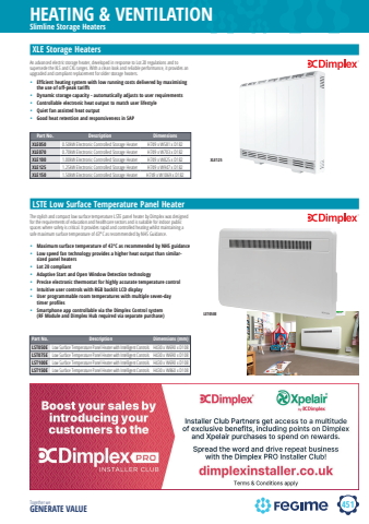 451HEATING & VENTILATIONTogether we GENERATE VALUESlimline Storage Heaters%u2022 Efficient heating system with low running costs delivered by maximising the use of off-peak tariffs%u2022 Dynamic storage capacity - automatically adjusts to user requirements%u2022 Controllable electronic heat output to match user lifestyle%u2022 Quiet fan assisted heat output%u2022 Good heat retention and responsiveness in SAPXLE Storage HeatersAn advanced electric storage heater, developed in response to Lot 20 regulations and to supersede the XLS and CXL ranges. With a clean look and reliable performance, it provides an upgraded and compliant replacement for older storage heaters.Part No. Description DimensionsXLE050 0.50kW Electronic Controlled Storage Heater H749 x W581 x D182XLE070 0.70kW Electronic Controlled Storage Heater H749 x W703 x D182XLE100 1.00kW Electronic Controlled Storage Heater H749 x W825 x D182XLE125 1.25kW Electronic Controlled Storage Heater H749 x W947 x D182XLE150 1.50kW Electronic Controlled Storage Heater H749 x W1069 x D182XLE125LSTE Low Surface Temperature Panel Heater%u2022 Maximum surface temperature of 43%u00baC as recommended by NHS guidance%u2022 Low speed fan technology provides a higher heat output than similarsized panel heaters %u2022 Lot 20 compliant%u2022 Adaptive Start and Open Window Detection technology%u2022 Precise electronic thermostat for highly accurate temperature control%u2022 Intuitive user controls with RGB backlit LCD display %u2022 User programmable room temperatures with multiple seven-day timer profiles %u2022 Smartphone app controllable via the Dimplex Control system (RF Module and Dimplex Hub required via separate purchase)The stylish and compact low surface temperature LSTE panel heater by Dimplex was designed for the requirements of education and healthcare sectors and is suitable for indoor public spaces where safety is critical. It provides rapid and controlled heating whilst maintaining a safe maximum surface temperature of 43%u00b0C as recommended by NHS Guidance.Part No. Description Dimensions (mm)LST050E Low Surface Temperature Panel Heater with Intelligent Controls H430 x W690 x D108LST075E Low Surface Temperature Panel Heater with Intelligent Controls H430 x W690 x D108LST100E Low Surface Temperature Panel Heater with Intelligent Controls H430 x W690 x D108LST150E Low Surface Temperature Panel Heater with Intelligent Controls H430 x W860 x D108LST050E