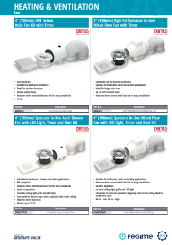 459HEATING & VENTILATIONTogether we GENERATE VALUE4%u201d (100mm) DVF In-lineAxial Fan Kit with TimerPart No. DescriptionDVF802ET In-line Axial Fan Kit with TimerPart No. DescriptionDVF832ET High Performance In-line Mixed Flow FanFans%u2022 Concealed fan%u2022 Suitable for bathroom and toilet%u2022 Ideal for shorter duct runs%u2022 Above ceiling fixing%u2022 Features timer control with duct kit for easy installation%u2022 17 l/s%u2022 Concealed fan for discreet operation%u2022 Suitable for bathroom, toilet and utility applications%u2022 Ideal for longer duct runs%u2022 Up to 44 l/s extract rates%u2022 Features timer control with duct kit for easy installation4%u201d (100mm) High Performance In-LineMixed Flow Fan with Timer4%u201d (100mm) Spotvent In-line Axial ShowerFan with LED Light, Timer and Duct KitPart No. DescriptionSPV802ETLED In-line Axial shower Fan with TimerPart No. DescriptionSPV832ETLED In-Line Mixed Flow Fan with LED Light%u2022 Suitable for bathroom, shower and toilet applications%u2022 ErP compliant%u2022 Features timer control with duct kit for easy installation%u2022 Quiet in operation%u2022 Includes ceiling light grille and LED light%u2022 Concealed for discreet operation; typically sited in the ceiling%u2022 Ideal for short duct runs%u2022 Extract up to 17 l/s%u2022 Suitable for bathroom, toilet and utility applications%u2022 Features timer control with duct kit for easy installation%u2022 Quiet in operation%u2022 Includes ceiling light grille and LED light%u2022 Concealed for discreet operation; typically sited in the ceiling Ideal for longer duct runs%u2022 40 l/s - low, 52 l/s - high4%u201d (100mm) Spotvent In-Line Mixed FlowFan with LED Light, Timer and Duct Kit