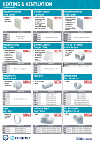 460HEATING & VENTILATIONTogether we GENERATE VALUE%u00d8100mm CowledDamper Outlet%u2022 Available in white, brown, terracotta or cotswold%u2022 4%u201d (100mm) male round spigot connection%u00d8150mm LouveredGrille Outlet110 x 54 - %u00d8100mmIn-line Adapter%u2022 Suitable for size 110 x 54mm to 100mm%u2022 White90%u00b0 HorizontalRigid Duct Bend%u2022 WhiteHorizontal Rigid Duct T Piece%u2022 White%u00d8100mm Louvered Grille Outlet%u2022 %u00d8100mm Louvered %u2022 Grille Outlet%u00d8150mm Gravity Flap Outlet%u2022 Available in white, brown, terracotta or cotswold%u2022 6%u201d (150mm) male round spigot connection external wall duct terminal%u00d8100mm GravityFlap Outlet%u2022 Available in white, brown, terracotta or cotswold%u2022 External wall duct terminals%u2022 4%u201d (100mm) male round spigot connectionPart No. Description6904W%u00d8150mm Louvered Grille Outlet 6904B6904T6904CPart No. DescriptionDD071 110 x 54 - %u00d8100mm In-line AdapterPart No. Description490 %u00d8100mm 90%u00b0 Horizontal Rigid Duct Bend590 %u00d8125mm 90%u00b0 Horizontal Rigid Duct Bend690 %u00d8150mm 90%u00b0 Horizontal Rigid Duct BendPart No. Description492 %u00d8100mm Horizontal Rigid Duct T Piece592 %u00d8125mm Horizontal Rigid Duct T Piece692 %u00d8150mm Horizontal Rigid Duct T PiecePart No. Description496 %u00d8100mm Rigid Duct Clip596 %u00d8125mm Rigid Duct Clip696 %u00d8150mm Rigid Duct ClipPart No. Description4904W%u00d8100mm Louvered Grille Outlet4904B4904T4904CPart No. Description6900W%u00d8150mm Gravity Flap Outlet 6900B6900T6900CPart No. Description4900W%u00d8100mm Gravity Flap Outlet 4900B4900T4900CPart No. Description4902W%u00d8100mm Gravity Flap Outlet 4902B4902T4902CFan Accessories%u00d8100mm PVC Flexible Hose%u2022 Flexible hose%u2022 Female connectionRigid Duct %u2022 Up to 2m length%u2022 WhiteStraight RigidDuct Connectors %u2022 WhitePart No. Description361%u00d8100mm PVC Flexible Hose3633663615663666Part No. Description1100-4 %u00d8100mm Rigid Duct1200-4 %u00d8100mm Rigid Duct1100-5 %u00d8125mm Rigid Duct1200-5 %u00d8125mm Rigid Duct1100-6 %u00d8150mm Rigid Duct1200-6 %u00d8150mm Rigid DuctPart No. Description493 %u00d8100mm Rigid Duct593 %u00d8125mm Rigid Duct693 %u00d8150mm Rigid Duct494 %u00d8100mm Rigid Duct with Damper594 %u00d8125mm Rigid Duct with Damper694 %u00d8150mm Rigid Duct with Damper%u2022 Available in white, brown, terracotta or cotswold%u2022 6%u201d (150mm) male round spigot connection%u2022 External wall duct terminalRigidDuct Clip %u2022 Fastener for round pipe systems
