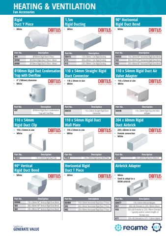 461HEATING & VENTILATIONTogether we GENERATE VALUERigid Duct Y Piece%u2022 White1.5m Rigid Ducting%u2022 White90%u00b0 Vertical Rigid Duct Bend%u2022 White%u00d8100mm Rigid Duct CondensationTrap with Overflow110 x 54mm Straight Rigid Duct Connector%u2022 110 x 54mm in size%u2022 White110 x 54mm Rigid DuctWall Plate%u2022 110 x 54mm in size%u2022 White110 x 54mm Rigid Duct Clip%u2022 110 x 54mm in size%u2022 WhiteAirbrick Adapter %u2022 White%u2022 Used to adapt to a 505W airbrick110 x 54mm Rigid Duct Air Valve Adapter%u2022 110 x 54mm in size%u2022 White90%u00b0 Horizontal Rigid Duct Bend%u2022 White204 x 60mm Rigid Duct Airbrick%u2022 204 x 60mm in size%u2022 Female connection%u2022 WhiteHorizontal RigidDuct T Piece%u2022 WhitePart No. Description499 %u00d8100mm Rigid Duct Y Piece599M %u00d8125mm Rigid Duct Y Piece - Metal699M %u00d8150mm Rigid Duct Y Piece - MetalPart No. DescriptionDD030 110 x 54mm Straight Rigid Duct ConnectorPart No. Description115-4 110 x 54mm Rigid Duct Wall PlatePart No. Description497 %u00d8100mm Rigid Duct Condensation Trap with Overfl owPart No. DescriptionDD050 110 x 54mm 90%u00b0 Horizontal Rigid Duct Bend550 204 x 60mm 90%u00b0 Horizontal Rigid Duct Bend950 220 x 90mm 90%u00b0 Horizontal Rigid Duct BendPart No. Description122-4 110 x 54mm Rigid Duct ClipPart No. DescriptionDD040 110 x 54mm Rigid Duct Air Valve AdapterPart No. DescriptionDD060 110 x 54mm 90%u00b0 Vertical Rigid Duct Bend560 204 x 60mm 90%u00b0 Vertical Rigid Duct Bend960 220 x 90mm 90%u00b0 Vertical Rigid Duct BendPart No. DescriptionDD077 110 x 54mm Airbrick Adapter957 204 x 60 (Female) to 220 x 90mm (Duct)958 204 x 60 (Female) to 220 x 90mm (Female) %u2013 Typically used to connect lengths of the two sizes977 220 x 90 (Female) to 227 x 133mm (Male)Part No. DescriptionDD015 110 x 54mm 1.5m Rigid Ducting515 204 x 60mm 1.5m Rigid Ducting915 220 x 90mm 1.5m Rigid DuctingPart No. DescriptionDD080 110 x 54mm Horizontal Rigid Duct T Piece582 204 x 60mm Horizontal Rigid Duct T Piece982 220 x 90mm Horizontal Rigid Duct T PiecePart No. Description505W 204 x 60mm Rigid Duct AirbrickFan Accessories%u2022 4%u201d (100mm) diameter%u2022 White