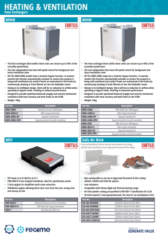 462HEATING & VENTILATIONTogether we GENERATE VALUEMVHRMEV Solis Air BrickPart No. DescriptionHRXE-HERA Standard Unit with 100% BypassHRXE-HERA-H With Integral HumidistatHRXE-HERA-OP Opposite Handed UnitHRXE-HERA-OPH Opposite Handed Unit with HumidistatPart No. DescriptionHRXE-AURA HRXE-AURA with 100% BypassHRXE-AURA-H With Integral HumidistatHRXE-AURA-OP Opposite Handed UnitHRXE-AURA-OPH Opposite Handed Unit with HumidistatHRXE-ZEUS HRXE ZEUS with 100% BypassHRXE-ZEUS-H With Integral HumidistatHRXE-ZEUS-OP Opposite Handed UnitHRXE-ZEUS-OPH Opposite Handed Unit with HumidistatPart No. DescriptionSOL-AB-204X60W 204x60mm Metal Air Brick WhiteSOL-AB-220X90W 220x90mm Metal Air Brick WhiteSOL-AB-220X126W 220x126mm Metal Air Brick WhiteSOL-DUCT-204X60 204X60mm Metal Sleeve 550mmSOL-DUCT-220X90 220x90mm Metal Sleeve 550mmSOL-DUCT-220X126 220x126mm Metal Sleeve 550mmPart No. DescriptionCMX-MULTI CMX Multi Mechanical Extract VentilationCMX-MULTI-H CMX Multi with Integral HumidistatCMX-S Void Mounted MEV UnitHeat ExchangersMVHR%u2022 The heat exchanger block within these units can recover up to 95% of the normally wasted heat%u2022 The two independent fans have full-speed control for background and boost ventilation rates%u2022 All The HRXE-HERA models have a Summer bypass function. In warmer months this function automatically activates to ensure the property is being well-ventilated and comfort levels are maintained in the home by continuously drawing in fresh filtered air into the habitable rooms%u2022 Owing to its intelligent design, there will be no reduction in airflow when operating in bypass mode, resulting in enhanced performance%u2022 Designed to provide optimised balanced (supply and extract) mechanical ventilation with heat recovery and both listed on the PCDB %u2022 Weight: 20kg%u2022 The heat exchanger block within these units can recover up to 95% of the normally wasted heat%u2022 The two independent fans have full-speed control for background and boost ventilation rates%u2022 All The HRXE-AURA range has a Summer bypass function. In warmer months this function automatically activates to ensure the property is being well-ventilated and comfort levels are maintained in the home by continuously drawing in fresh filtered air into the habitable rooms%u2022 Owing to its intelligent design, there will be no reduction in airflow when operating in bypass mode, resulting in enhanced performance%u2022 Designed to provide optimised balanced (supply and extract) mechanical ventilation with heat recovery and both listed on the PCDB%u2022 Weight: 24kg%u2022 SFP down to 0.14 (W/l/s) at K+1%u2022 CMX-MULTI-H has integral humidistat, ideal for specification works%u2022 3 inlet spigots for simplified multi-room extraction%u2022 204x60mm spigots allowing direct duct runs from the unit, saving time and money on siteA non-combustible air brick to maintain low resistance and comply with the latest standards set out in Approved Document B (fi re safety).%u2022 Non-combustible as set out in Approved Document B (fire safety)%u2022 204x60, 220x90 and 220x126 options%u2022 Low resistance%u2022 Compatible with Domus Rigid and Thermal ducting range%u2022 Air brick powder coating pre-qualified to EN13501-1 classification A2-s1,d0%u2022 Air brick material 1.5mm galvanized steel, fire class A1 %u2018no contribution to fire