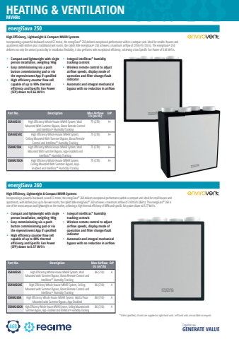 468HEATING & VENTILATIONTogether we GENERATE VALUEenergiSava 250MVHRsHigh Effi ciency, Lightweight & Compact MVHR SystemsIncorporating a powerful backward curved EC motor, the energiSava%u00ae 250 delivers exceptional performance within a compact unit. Ideal for smaller houses and apartments with kitchen plus 3 additional wet rooms, the stylish little energiSava%u00ae 250 achieves a maximum airfl ow of 270m3/h (75l/s). The energiSava%u00ae 250 delivers not only the utmost practicality in installation fl exibility, it also performs with exceptional effi ciency, achieving a low Specifi c Fan Power of 0.66 W/l/s.Part No. Description Max Airfl ow l/s (m3/h)ErPESAVA250 High Effi ciency Whole House MVHR System, Wall Mounted With Summer Bypass, Boost Remote Control and Intellitrac%u00ae Humidity Tracking75 (270) A+ESAVA250C High Effi ciency Whole House MVHR System, Ceiling Mounted With Summer Bypass, Boost Remote Control and Intellitrac%u00ae Humidity Tracking75 (270) A+ESAVA250A High Effi ciency Whole House MVHR System, Wall Mounted With Summer Bypass, App-Enabled and Intellitrac%u00ae Humidity Tracking75 (270) A+ESAVA250CA High Effi ciency Whole House MVHR System, Ceiling Mounted With Summer Bypass, AppEnabled and Intellitrac%u00ae Humidity Tracking75 (270) A+%u2022 Compact and lightweight with single person installation, weighing 14kg %u2022 Easy commissioning via a push button commissioning pad or via the myenvirovent App if specified%u2022 High efficiency counter flow cell capable of up to 90% thermal efficiency and Specific Fan Power (SFP) down to 0.66 W/l/s%u2022 Integral Intellitrac%u00ae humidity tracking controls %u2022 Wireless remote control to adjust airflow speeds, display mode of operation and filter change/fault indicator%u2022 Automatic and integral mechanical bypass with no reduction in airflowenergiSava 260High Effi ciency, Lightweight & Compact MVHR Systems Incorporating a powerful backward curved EC motor, the energiSava%u00ae 260 delivers exceptional performance within a compact unit. Ideal for small houses and apartments, with kitchen plus up to fi ve wet rooms, the stylish little energiSava%u00ae 260 achieves a maximum airfl ow of 310m3/h (86l/s). The energiSava%u00ae 260 is one of the most compact and lightweight on the market, achieving a high thermal effi ciency of 88% and specifi c fan power down to 0.57 W/l/s.%u2022 Compact and lightweight with single person installation, weighing 14kg %u2022 Easy commissioning via a push button commissioning pad or via the myenvirovent App if specified %u2022 High efficiency counter flow cell capable of up to 88% thermal efficiency and Specific Fan Power (SFP) down to 0.57 W/l/s %u2022 Integral Intellitrac%u00ae humidity tracking controls %u2022 Wireless remote control to adjust airflow speeds, display mode of operation and filter change/fault indicator %u2022 Automatic and integral mechanical bypass with no reduction in airflow*Unless specifi ed, all units are supplied as right-hand units. Left hand units are available on request.Part No. Description Max Airfl ow l/s (m3/h) ErPESAVA260 High Effi ciency Whole House MVHR System, Wall Mounted with Summer Bypass, Boost Remote Control and Intellitrac%u00ae Humidity Tracking 86 (310) AESAVA260C High Effi ciency Whole House MVHR System, Ceiling Mounted with Summer Bypass, Boost Remote Control and Intellitrac%u00ae Humidity Tracking 86 (310) AESAVA260A High Effi ciency Whole House MVHR System, Wall & Floor Mounted with Summer Bypass, App-Enabled 86 (310) AESAVA260CA High Effi ciency Whole House MVHR System, Ceiling Mounted with Summer Bypass, App- Enabled and Intellitrac%u00ae Humidity Tracking 86 (310) A