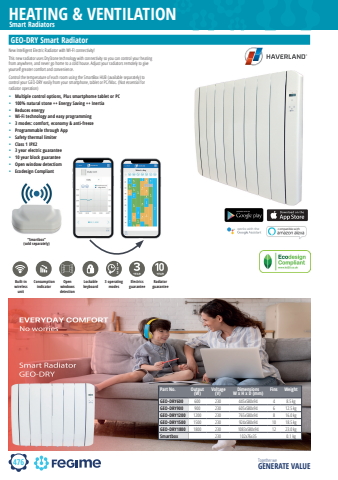 476HEATING & VENTILATIONTogether we GENERATE VALUESmart Radiatorsgoogle assistant amazon alexagoogle play apple app storehaverlandGEO-DRY Smart RadiatorNew Intelligent Electric Radiator with WI-FI connectivity!This new radiator uses DryStone technology with connectivity so you can control your heating from anywhere, and never go home to a cold house. Adjust your radiators remotely to give yourself greater comfort and convenience. Control the temperature of each room using the SmartBox HUB (available separately) to control your GEO-DRY easily from your smartphone, tablet or PC/Mac. (Not essential for radiator operation) %u2022 Multiple control options, Plus smartphome tablet or PC%u2022 100% natural stone ++ Energy Saving ++ Inertia%u2022 Reduces energy%u2022 Wi-Fi technology and easy programming%u2022 3 modes: comfort, economy & anti-freeze%u2022 Programmable through App%u2022 Safety thermal limiter%u2022 Class 1 IPX2%u2022 3 year electric guarantee%u2022 10 year block guarantee%u2022 Open window detectiom%u2022 Ecodesign CompliantBuilt-in wireless unitConsumption indicatorOpen windows detectionLockable keyboard3 operating modesElectrics guaranteeRadiator guaranteeworks with the compatible with%u201cSmartbox%u201d(sold separately)Part No. Output (W) Voltage (V)Dimensions W x H x D (mm)Fins WeightGEO-DRY600 600 230 445x580x94 4 8.5 kgGEO-DRY900 900 230 605x580x94 6 12.5 kgGEO-DRY1200 1200 230 765x580x94 8 16.0 kgGEO-DRY1500 1500 230 924x580x94 10 18.5 kgGEO-DRY1800 1800 230 1083x580x94 12 23.0 kgSmartbox 230 102x76x35 0.1 kg