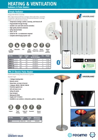 479HEATING & VENTILATIONTogether we GENERATE VALUERadiators & Patio HeatersPH-21 Electric Patio HeaterPart No. Output (W) Voltage (V)Dimensions H x D (mm)PH-21 900-1200-2100 220-240 2050x585 Excellent outdoor heating. Perfect for terraces or gardens!Adjustable height!%u2022 2 Halogen heating tubes%u2022 Remote control%u2022 Heavy base, not easy to tip over%u2022 3 Outputs: 900 W; 1200 W; 2100 W%u2022 Protection against rust%u2022 Safe and easy to use%u2022 Safety tilt switch%u2022 Easy transport%u2022 Waterproof (IP44)%u2022 Supply cord 1.8 meters%u2022 Available to use outdoors, restaurants, gardens, campings, etcSafetytilt switchOFFQuickHeatingOutputs 3GuaranteeYEARSafetytilt switchOFFQuickHeatingOutputs 3GuaranteeRemotecontrolYEARSafetytilt switchOFFQuickHeatingOutputs 3Safetytilt switchOFFQuickHeatingOutputs 3GuaranteeRemote controlYEARSafetytilt switchOFFQuickHeatingOutputs 3GuaranteeRemotecontrolYEAROutputs Safety Tilt SwitchGuarantee Remote ControlQuick HeatingPart No. Output (W)Voltage (V)Dimensions W x H x D (mm)Fins WeightSIMPLY-4 600 230 435x580x95 4 9.0 kgSIMPLY-6 900 230 595x580x95 6 13.0 kgSIMPLY-8 1200 230 750x580x95 8 17.0 kgSIMPLY-10 1500 230 910x580x95 10 21.0 kgSIMPLY-12 1800 230 1070x580x95 12 25.0 kgSTARTADAPTIVESTARTADAPTIVESTARTADAPTIVESTARTADAPTIVESTARTADAPTIVESTARTADAPTIVESTARTADAPTIVEFully controllable electronic Manual dial %u201cITCS%u201d Open windows detection24 h / 7 d ProgrammingElectrics guaranteeRadiator block guaranteeSimply RadiatorAnalogue With Wireless Connectivity With a single control you will have an analogue radiator with wireless connectivity. It incorporates a high precision electronic thermostat with Bluetooth%u00ae technology. Suitable to be used with external controllers. %u2022 Temperature settings: comfort, economy, anti-freeze & off%u2022 Programmable through the App%u2022 Suitable to be used with external controllers%u2022 High-quality aluminum elements%u2022 Safety thermal limiter%u2022 Class I. IP 24%u2022 Sealed for life - no maintenance required%u2022 Complete with UK plug & power cord