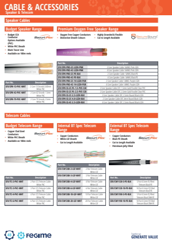 48CABLE & ACCESSORIESTogether we GENERATE VALUEBudget Speaker RangeBudget Telecom Range Internal BT Spec TelecomRangeExternal BT Spec TelecomRangePremium Oxygen Free Speaker Range%u2022 Budget CCA Conductor Options Available (PVC)%u2022 White PVC Sheath%u2022 Black Tracer Line%u2022 Available on 100m reels%u2022 Copper Clad Steel Conductors%u2022 White PVC Sheath%u2022 Available on 100m reels%u2022 Copper Conductors%u2022 White LSF Sheath%u2022 Cut to Length Available%u2022 Copper Conductors%u2022 Black PE Sheath%u2022 Cut to Length Available%u2022 Petroleum Jelly Filled%u2022 Oxygen Free Copper Conductors%u2022 Distinctive Sheath Colours%u2022 Highly Stranded & Flexible%u2022 Cut to Length AvailablePart No. DescriptionSFX/SPK-13-PVC-WHT 2 Core 13 Strands 0.40mm White PVCSFX/SPK-42-PVC-WHT 2 Core 42 Strands 1.5mm White PVCSFX/SPK-79-PVC-WHT 2 Core 79 Strands 2.5mm White PVCPart No. DescriptionSFX/TC-2-PVC-WHT 2 Pair CCS Telecom Cable White PVCSFX/TC-3-PVC-WHT 3 Pair CCS Telecom Cable White PVCSFX/TC-4-PVC-WHT 4 Pair CCS Telecom Cable White PVCSFX/TC-6-PVC-WHT 6 Pair CCS Telecom Cable White PVCPart No. DescriptionSFX/CW1308-2-LSF-WHT 2 Pair Telecom Cable White LSFSFX/CW1308-3-LSF-WHT 3 Pair Telecom Cable White LSFSFX/CW1308-4-LSF-WHT 4 Pair Telecom Cable White LSFSFX/CW1308-6-LSF-WHT 6 Pair Telecom Cable White LSFSFX/CW1308-10-LSF-WHT 10 Pair Telecom Cable White LSFSFX/CW1308-20-LSF-WHT 20 Pair Telecom Cable White LSFPart No. DescriptionSFX/CW1128-5-PE-BLK 5 Pair 0.5mm PJ Filled Telecom Black PESFX/CW1128-10-PE-BLK 10 Pair 0.5mm PJ Filled Telecom Black PESFX/CW1198-5-PE-BLK 5 Pair 0.5mm PJ Filled Telecom Black SWA PESFX/CW1198-10-PE-BLK 10 Pair 0.5mm PJ Filled Telecom Black SWA PEPart No. DescriptionSFX/SPK-PRO-2C-LSZH-PNK 2 Core Speaker Cable 16AWG Pink LSZHSFX/SPK-PRO-4C-LSZH-PNK 4 Core Speaker Cable 16AWG Pink LSZHSFX/SPK-PRO-2C-PE-BLK 2 Core Speaker Cable 16AWG Black PESFX/SPK-PRO-4C-PE-BLK 4 Core Speaker Cable 16AWG Black PESFX/SPK-PRO-2C-14-LSZH-PUR 2 Core Speaker Cable 14AWG Purple LSZHSFX/SPK-PRO-4C-14-LSZH-PUR 4 Core Speaker Cable 14AWG Purple LSZHSFX/SPK-SS-2C-PL-1.5-PVC-CLR 2 Core Speaker Cable OFC 1.5mm Gold Parallel Clear PVCSFX/SPK-SS-2C-PL-2.5-PVC-CLR 2 Core Speaker Cable OFC 2.5mm Gold Parallel Clear PVCSFX/SPK-SS-2C-2.5-LSZH-BLK 2 Core Speaker Cable OFC 2.5mm Round Black LSZHSFX/SPK-SS-2C-4.0-LSZH-BLK 2 Core Speaker Cable OFC 4mm Round Black LSZHSFX/SPK-SS-4C-2.5-LSZH-BLK 4 Core Speaker Cable OFC 2.5mm Round Black LSZH Speaker & TelecomTelecom CablesSpeaker Cables