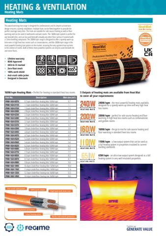 480HEATING & VENTILATIONTogether we GENERATE VALUEheat matheatmatHeating MatsHeating MatsPart No. Description Mat size (m%u00b2)PKM-160-0070 0.7sqm Underfl oor Heating Mat 160W/sqm 0.7PKM-160-0110 1.1sqm Underfl oor Heating Mat 160W/sqm 1.1PKM-160-0150 1.5sqm Underfl oor Heating Mat 160W/sqm 1.5PKM-160-0200 2.0sqm Underfl oor Heating Mat 160W/sqm 2.0PKM-160-0230 2.3sqm Underfl oor Heating Mat 160W/sqm 2.3PKM-160-0280 2.8sqm Underfl oor Heating Mat 160W/sqm 2.8PKM-160-0310 3.1sqm Underfl oor Heating Mat 160W/sqm 3.1PKM-160-0370 3.7sqm Underfl oor Heating Mat 160W/sqm 3.7PKM-160-0390 3.9sqm Underfl oor Heating Mat 160W/sqm 3.9PKM-160-0440 4.4sqm Underfl oor Heating Mat 160W/sqm 4.4PKM-160-0470 4.7sqm Underfl oor Heating Mat 160W/sqm 4.7PKM-160-0520 5.2sqm Underfl oor Heating Mat 160W/sqm 5.2PKM-160-0560 5.6sqm Underfl oor Heating Mat 160W/sqm 5.6PKM-160-0620 6.2sqm Underfl oor Heating Mat 160W/sqm 6.2PKM-160-0680 6.8sqm Underfl oor Heating Mat 160W/sqm 6.8PKM-160-0770 7.7sqm Underfl oor Heating Mat 160W/sqm 7.7PKM-160-0830 8.3sqm Underfl oor Heating Mat 160W/sqm 8.3PKM-160-0870 8.7sqm Underfl oor Heating Mat 160W/sqm 8.7PKM-160-0980 9.8sqm Underfl oor Heating Mat 160W/sqm 9.8PKM-160-1040 10.4sqm Underfl oor Heating Mat 160W/sqm 10.4PKM-160-1160 11.6sqm Underfl oor Heating Mat 160W/sqm 11.6PKM-160-1250 12.5sqm Underfl oor heating mat 160W/sqm 12.5PKM-160-1450 14.5sqm Underfl oor heating mat 160W/sqm 14.5160W/sqm Heating Mats - Perfect for heating in standard heat loss roomsThis award winning mat range is designed for professionals and its simple cut-and-turn design ensures a speedy installation; multiple mats can be fi tted together to provide the perfect coverage every time. The mats are suitable for sole source heating as well as fl oor warming and can be used in bathrooms and wet rooms. The 160W/sqm system is perfect for use beneath tiles, and can be used beneath virtually any other fl oor surface if covered with a 12mm levelling compound. The 200W/sqm range is designed to off er a speedy warm up time even in high heat loss rooms such as conservatories, and the 240W/sqm range is the most powerful heating mat system on the market, ensuring the very quickest heat up time in the coldest of rooms. Both of these more powerful systems can only be used beneath tile and stone fl oors.%u2022 Lifetime warranty%u2022 BEAB Approved%u2022 UKCA & CE marked%u2022 Zero-float mesh%u2022 100% earth shield%u2022 Anti-crush cable jacket%u2022 Designed in DenmarkANTI-CRUSH5 Outputs of heating mats are available from Heat Mat to cover all your requirements:240W/sqm - the most powerful heating mats available, designed for a speedy warm up time and very high heat loss rooms200W/sqm - perfect for sole source heating and fl oor warming in high heat loss rooms such as conservatories and garden rooms160W/sqm - the go to mat for sole source heating and fl oor warming in standard heat loss rooms110W/sqm - a low output system that can be used as a full heating system in properties insulated to current building standards65W/sqm - an ultra-low output system designed as a full heating system in very well insulated properties