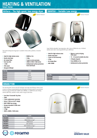 494HEATING & VENTILATIONTogether we GENERATE VALUESmart HomeThe market leading low energy dryer is available in black, white, polished, or brushed chrome. Our new entry level %u201cclick-on click-off , fi t & forget%u201d mid-range units off ering a choice of cool or warm air drying, incorporating the same back plate & connector system as our premium Airstream range, but fi tted with a 600W motor (MR600), or a 600W motor plus heating element (MR1100), available in white, white no logo & nickel silver.Super-fl exible adjustable, low energy dryer, with a choice of White die cast, or Polished stainless-steel covers. Extra-long brush life up to 2400 hoursAirforce %u2013 The high speed, low energy dryerMR600/1100SMARTdri %u2013 Variable Low energy%u2022 Ideal for high volume areas %u2022 Hands only dryer%u2022 Air intake filter %u2022 Fast dry time%u2022 1.1kW %u2022 IP24 rated %u2022 Airspeed 205mph %u2022 85dBA at 1m%u2022 3.2kg %u2022 3-year on-site warranty %u2022 230W X 270H X 156D (mm)%u2022 Antibacterial surface protection from SteriTouch%u2022 Less than 16 seconds%u2019 dry time%u2022 75dB%u2022 2-year replacement warranty%u2022 Secure %u201cclick-on & off%u201d design%u2022 600/1100W low energy %u2022 Strong & durable PC ABS cover %u2022 IP24 rated %u2022 2.7kgs%u2022 282H x 260W x 152D (mm) %u2022 Ideal for high volume areas%u2022 Hands only dryer%u2022 5-year on-site warranty %u2022 5.2kg%u2022 Air intake filter %u2022 400-1200W%u2022 Warm or cool air drying IP24 rated%u2022 15 %u2013 25 second variable dry time%u2022 215mph airspeed%u2022 From 68DBA at 1m %u2022 Antibacterial surface protectionPart No. FinishBC0325 Black BC0323 WhiteBC0326 PolishedBC0327 Brushed Part No. Finish17033949 MR600 White091585PR MR600 White no logo*17033937 MR600 Nickel17033421 MR1100 White091586PR MR1100 White no logo *17033410 MR1100 NickelPart No. Finish16412400 White16412801 Stainless steel