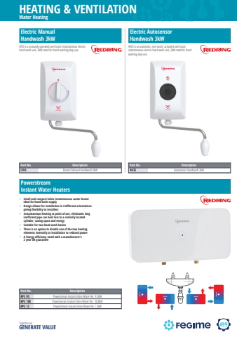 499HEATING & VENTILATIONTogether we GENERATE VALUEWater HeatingElectric Manual Handwash 3kWI3VS is a manually operated over basin instantaneous electric hand wash unit, 3kW rated for hand washing duty use.Part No. DescriptionI3VS Electric Manual Handwash 3kWAV3S is an automatic, non-touch, activated over basin instantaneous electric hand wash unit, 3kW rated for hand washing duty use.Electric AutosensorHandwash 3kWPart No. DescriptionAV3S Autosensor Handwash 3kWPowerstream Instant Water HeatersPart No. DescriptionRPS 95 Powerstream Instant Inline Water Htr. 9.5kWRPS 108 Powerstream Instant Inline Water Htr. 10.8kWRPS 12 Powerstream Instant Inline Water Htr. 12kW%u2022 Small and compact inline instantaneous water heater ideal for hand basin supply%u2022 Design allows for installation in 4 different orientations giving flexibility to installers%u2022 Instantaneous heating at point of use, eliminates long inefficient pipe run heat loss to a centrally located cylinder, saving space and energy%u2022 Suitable for two hand wash basins%u2022 There is an option to disable one of the two heating elements internally at installation to reduced power%u2022 A Energy efficiency rated with a manufacturer's 2 year UK guarantee