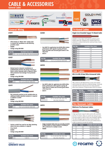 5CABLE & ACCESSORIESTogether we GENERATE VALUESingle Core CableSteel Wired ArmouredTwin & EarthTwin and Earthbatt cablesjaylow supplies ltd jsl nexanscleveland cable companypremier cablespx cableseland cablesqing cablesgoldwingukcuk cablesukcablesdoncaster cablesGeneral CableGeneral Wiring%u2022 Often known as %u201cMeter Tails%u201d mainly used to connect the Installation to the Electricity providers meter%u2022 BS6004%u2022 Voltage rating 300/500VPart No. Available Sizes (mm)6181Y 1.0, 1.5, 2.5, 4.0, 6.0, 10.0, 16.0, 25.0 & 35.0Single Core CableTwin & EarthTwin and Earth6181Y%u2022 Mainly found in domestic installations as predominantly used for the wiring of houses or where surface mounted cable is required. Offers little protection from damage if not protected%u2022 BS6004%u2022 Voltage rating 300/500VPart No. Available Sizes (mm)6242Y 1.0, 1.5, 2.5, 4.0, 6.0, 10.0 & 16.06242Y%u2022 Not commonly used but can be suitable when an additional double sheathed conductor is required in addition to 6243Y%u2022 BS6004%u2022 Voltage rating 300/500VPart No. Available Sizes (mm)6242Y 1.0, 1.5, 2.5, 4.0, 6.0, 10.0 & 16.06241Y%u2022 Similar to 6242Y but used for two Way Switching where the extra conductor is required%u2022 Grey sheath%u2022 BS6004%u2022 Voltage rating 300/500VPart No. Available Sizes (mm)6243Y 1.0 & 1.56243Y%u2022 See 6242Y for applications but 6242B offers better performance with regards to giving off lower levels of smoke and corrosive gases where a fire may occur%u2022 BS7211Part No. Available Sizes (mm)6242B 1.0, 1.5, 2.5, 4.0, 6.0, 10.0 & 16.06242B%u2022 See 6491X cables for application but 6491B offers better performance with regards to giving off lower levels of smoke and corrosive gases where a fire may occur%u2022 BS7211Part No. Available Sizes (mm)6491B 1.5, 2.5, 4.0, 6.0, 10.0, 16.0, 25.0,35.0, 50.0, 70.0 & 95.06491B%u2022 Single Insulated Cables that are normally installed in either plastic or metal conduit or trunking to offer protection for multiple circuits%u2022 BS6004Part No. Available Sizes (mm)6491X 1.5, 2.5, 4.0, 6.0, 10.0, 16.0, 25.0,35.0, 50.0, 70.0 & 95.06491XTri-Rated CablesAvailable in many colours and used very widely by panel builders where the 105degree PVC insulation gives more protection to ambient heat and the numerous colour choices aid identifi cation.Part No. Available Sizes (mm)TRI0.75 0.75TRI1.0 1.0TRI1.5 1.5TRI2.5 2.5TRI4.5 4.5TRI6.0 6.0TRI25 25.0TRI35 35.0TRI50 50.0TRI70 70.0Single Core Stranded Copper Tri-Rated CableSteel Wired ArmouredSWA CablesSWA, stands for Steel Wired Armour as this is the method used to protect the cable from accidental damage, Commonly used when buried in the ground or for surface mounted where more protection is required above 6242Y for example.Part No.StandardPart No.Low SmokeAvailable Sizes (mm)Cores6942X 6942B 1.5, 2.5, 4.0, 6.0, 10 & 16 26943X 6943B 1.5, 2.5, 4.0, 6.0, 10 & 16 36944X 6944B 1.5, 2.5, 4.0, 6.0, 10 & 16 46945X 6945B 1.5, 2.5, 4.0, 6.0, 10 & 16 5694_X & 694_B Steel Wire Armoured CableFire Resistant CablesMulticore Fire Resistant CablesSize mm Cores Available Sheath Colour1.5 2+E Red, White & Black2.5 2+E Red, White & Black1.5 3+E Red, White & Black2.5 3+E Red, White & Black1.5 4+E Red, White & Black2.5 4+E Red, White & BlackA high specifi cation range of cables used to off er protection from fi re. Fire Alarm cables are used for the wiring of actual fi re alarm systems as well in some cases Emergency Lighting. The cable undergoes rigorous tests to ensure it does not deteriorate and fail within strict time and condition tests to enable occupants to evacuate the building.