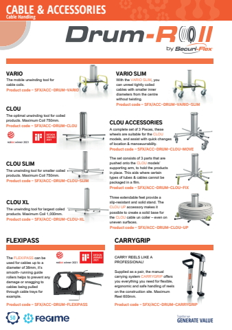 50CABLE & ACCESSORIESTogether we GENERATE VALUECLOU XLCLOU SLIMThe set consists of 3 parts that arepushed onto the CLOU models%u2019supporting arm, to hold the productsin place. This aids where certaintypes of tubes & cables cannot bepackaged in a film.Three extendable feet provide aslip-resistant and solid stand. TheCLOU UP accessory makes itpossible to create a solid base forthe CLOU cable un coiler %u2013 even onuneven surfaces.COILED CABLE ROLLERSVARIOThe mobile unwinding tool forcable coils.VARIO SLIMWith the VARIO SLIM, youcan unreel tightly coiledcables with smaller innerdiameters from the centrewithout twisting.Product code - SFX/ACC-DRUM-VARIO-SLIMProduct code - SFX/ACC-DRUM-VARIOCLOUProduct code - SFX/ACC-DRUM-CLOUThe optimal unwinding tool for coiledproducts. Maximum Coil 750mm.Product code - SFX/ACC-DRUM-CLOU-SLIMThe unwinding tool for smaller coiledproducts. Maximum Coil 750mm.byProduct code - SFX/ACC-DRUM-CLOU-XLThe unwinding tool for largest coiledproducts. Maximum Coil 1,000mm.CLOU ACCESSORIESA complete set of 3 Pieces, thesewheels are suitable for the CLOUmodels, and assist with quick changesof location & manoeuvrability.Product code - SFX/ACC-DRUM-CLOU-MOVEProduct code - SFX/ACC-DRUM-CLOU-FIXProduct code - SFX/ACC-DRUM-CLOU-UPFLEXIPASS CARRYGRIPThe FLEXIPASS can beused for cables up to adiameter of 38mm, it%u2019ssmooth- running guiderollers helps to prevent anydamage or snagging tocables being pulledthrough cable trays forexample.Product code - SFX/ACC-DRUM-FLEXIPASSCARRY REELS LIKE APROFESSIONAL!Supplied as a pair, the manualcarrying system CARRYGRIP offersyou everything you need for flexible,ergonomic and safe handling of reelson the construction site. MaximumReel 600mm.Product code - SFX/ACC-DRUM-CARRYGRIPCLOU XLCLOU SLIMThe set consists of 3 parts that arepushed onto the CLOU models%u2019supporting arm, to hold the productsin place. This aids where certaintypes of tubes & cables cannot bepackaged in a film.Three extendable feet provide aslip-resistant and solid stand. TheCLOU UP accessory makes itpossible to create a solid base forthe CLOU cable un coiler %u2013 even onuneven surfaces.COILED CABLE ROLLERSVARIOThe mobile unwinding tool forcable coils.VARIO SLIMWith the VARIO SLIM, youcan unreel tightly coiledcables with smaller innerdiameters from the centrewithout twisting.Product code - SFX/ACC-DRUM-VARIO-SLIMProduct code - SFX/ACC-DRUM-VARIOCLOUProduct code - SFX/ACC-DRUM-CLOUThe optimal unwinding tool for coiledproducts. Maximum Coil 750mm.Product code - SFX/ACC-DRUM-CLOU-SLIMThe unwinding tool for smaller coiledproducts. Maximum Coil 750mm.byProduct code - SFX/ACC-DRUM-CLOU-XLThe unwinding tool for largest coiledproducts. Maximum Coil 1,000mm.CLOU ACCESSORIESA complete set of 3 Pieces, thesewheels are suitable for the CLOUmodels, and assist with quick changesof location & manoeuvrability.Product code - SFX/ACC-DRUM-CLOU-MOVEProduct code - SFX/ACC-DRUM-CLOU-FIXProduct code - SFX/ACC-DRUM-CLOU-UPFLEXIPASS CARRYGRIPThe FLEXIPASS can beused for cables up to adiameter of 38mm, it%u2019ssmooth- running guiderollers helps to prevent anydamage or snagging tocables being pulledthrough cable trays forexample.Product code - SFX/ACC-DRUM-FLEXIPASSCARRY REELS LIKE APROFESSIONAL!Supplied as a pair, the manualcarrying system CARRYGRIP offersyou everything you need for flexible,ergonomic and safe handling of reelson the construction site. MaximumReel 600mm.Product code - SFX/ACC-DRUM-CARRYGRIPCable HandlingCLOU XLCLOU SLIMThe set consists of 3 parts that arepushed onto the CLOU models%u2019supporting arm, to hold the productsin place. This aids where certaintypes of tubes & cables cannot bepackaged in a film.Three extendable feet provide aslip-resistant and solid stand. TheCLOU UP accessory makes itpossible to create a solid base forthe CLOU cable un coiler %u2013 even onuneven surfaces.COILED CABLE ROLLERSVARIOThe mobile unwinding tool forcable coils.VARIO SLIMWith the VARIO SLIM, youcan unreel tightly coiledcables with smaller innerdiameters from the centrewithout twisting.Product code - SFX/ACC-DRUM-VARIO-SLIMProduct code - SFX/ACC-DRUM-VARIOCLOUProduct code - SFX/ACC-DRUM-CLOUThe optimal unwinding tool for coiledproducts. Maximum Coil 750mm.Product code - SFX/ACC-DRUM-CLOU-SLIMThe unwinding tool for smaller coiledproducts. Maximum Coil 750mm.byProduct code - SFX/ACC-DRUM-CLOU-XLThe unwinding tool for largest coiledproducts. Maximum Coil 1,000mm.CLOU ACCESSORIESA complete set of 3 Pieces, thesewheels are suitable for the CLOUmodels, and assist with quick changesof location & manoeuvrability.Product code - SFX/ACC-DRUM-CLOU-MOVEProduct code - SFX/ACC-DRUM-CLOU-FIXProduct code - SFX/ACC-DRUM-CLOU-UPFLEXIPASS CARRYGRIPThe FLEXIPASS can beused for cables up to adiameter of 38mm, it%u2019ssmooth- running guiderollers helps to prevent anydamage or snagging tocables being pulledthrough cable trays forexample.Product code - SFX/ACC-DRUM-FLEXIPASSCARRY REELS LIKE APROFESSIONAL!Supplied as a pair, the manualcarrying system CARRYGRIP offersyou everything you need for flexible,ergonomic and safe handling of reelson the construction site. MaximumReel 600mm.Product code - SFX/ACC-DRUM-CARRYGRIP