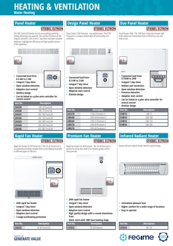 505HEATING & VENTILATIONTogether we GENERATE VALUEWater HeatingPart No. Description236559 CNS 50 Trend UK236560 CNS 75 Trend UK236561 CNS 100 Trend UK236562 CNS 150 Trend UK236563 CNS 200 Trend UK236564 CNS 250 Trend UK236565 CNS 300 Trend UKPart No. Description234813 CND 75234814 CND 100234815 CND 150234816 CND 200Part No. Description201278 CON 5 Premium U200268 CON 10 Premium U200269 CON 15 Premium U200270 CON 20 Premium U200276 CON 30 Premium UPart No. Description236653 CK 20 Trend LCDPart No. Description237835 CK 20 PremiumPart No. Description229339 IW 120Panel HeaterThe CNS Trend UK blends into its surroundings perfectly, silently delivering cosy warmth. The comfort functions of the integral controller, such as the 7 day timer and open window detection, highlight the effi ciency and high quality features of the appliance.Panel heater CON Premium - top performance. The CON Premium is a unique combination of functionality and aesthetics.Panel heater CND - The CND Duo-Convection heater with both radiant and convection heat is effi cient to run and easy to use.Design Panel Heater Duo Panel Heater%u2022 Connected load from 0.5 kW to 3 kW%u2022 Integral 7 day timer%u2022 Open window detection.%u2022 Adaptive start control%u2022 Slimline design%u2022 Can be linked to a pilot wire controller for central control%u2022 Connected load from 0.5 kW to 3 kW%u2022 Integral 7 day timer%u2022 Open window detection%u2022 Adaptive start control%u2022 Slimline design%u2022 Connected load from 0.75kW to 2kW%u2022 Integral 7 day timer%u2022 Radiant and convection%u2022 Open window detection%u2022 Presence detection%u2022 Adaptive start control%u2022 Can be linked to a pilot wire controller for central control%u2022 Slimline designRapid Fan HeaterRapid fan heater CK 20 Trend LCD | The CK 20 Trend LCD is an economical heating solution that can be deployed quickly in diff erent types of interiors.Rapid fan heater CK 20 Premium. The CK 20 Premium is perfect for areas that need to be heated quickly and for short periods.Quartz infrared radiant heater ideal for spot heating.Premium Fan Heater Infrared Radiant Heater%u2022 2kW rapid fan heater%u2022 Integral 7 day timer%u2022 Open window detection%u2022 Adaptive start control%u2022 3-stage overheating protection%u2022 2kW rapid fan heater%u2022 Integral 7 day timer%u2022 Open window detection%u2022 Adaptive start control%u2022 High quality design with a curved aluminium front%u2022 Silent more with 1kW base heating stage%u2022 Immediate pleasant heat%u2022 Higher comfort for a wide range of locations%u2022 Easy to operate
