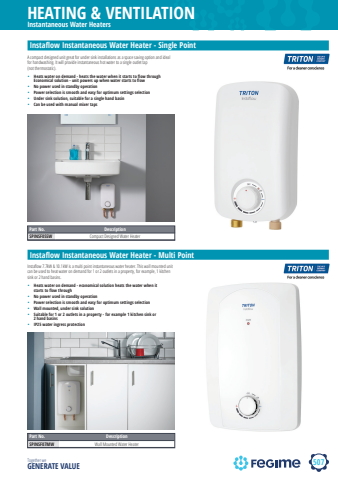 507HEATING & VENTILATIONTogether we GENERATE VALUEInstantaneous Water Heaters%u2022 Heats water on demand - heats the water when it starts to flow through Economical solution - unit powers up when water starts to flow%u2022 No power used in standby operation%u2022 Power selection is smooth and easy for optimum settings selection%u2022 Under sink solution, suitable for a single hand basin%u2022 Can be used with manual mixer tapsInstaflow Instantaneous Water Heater - Single PointA compact designed unit great for under sink installations as a space saving option and ideal for handwashing. It will provide instantaneous hot water to a single outlet tap (not thermostatic).Part No. DescriptionSPINSF05SW Compact Designed Water Heater%u2022 Heats water on demand - economical solution heats the water when it starts to flow through%u2022 No power used in standby operation%u2022 Power selection is smooth and easy for optimum settings selection%u2022 Wall mounted, under sink solution%u2022 Suitable for 1 or 2 outlets in a property - for example 1 kitchen sink or 2 hand basins%u2022 IP25 water ingress protectionInstaflow Instantaneous Water Heater - Multi PointInstafl ow 7.7kW & 10.1kW is a multi point instantaneous water heater. This wall mounted unit can be used to heat water on demand for 1 or 2 outlets in a property, for example, 1 kitchen sink or 2 hand basins.Part No. DescriptionSPINSF07MW Wall Mounted Water Heater
