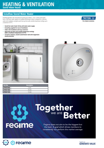 508HEATING & VENTILATIONTogether we GENERATE VALUE%u2022 Stored hot water heater fed by cold mains water supply%u2022 Everything supplied for ease of installation%u2022 Under-sink installation with top connectors%u2022 Quick heat up times and variable temperature settings (with a maximum temperature of 75%u00b0C)%u2022 Corrosion resistant, enamel coated heater tank with magnesium anode protectionInstaflow Stored Water HeaterProviding high fl ow rates and perfect for storing up to either 5, 10 or 15 litres of hot water from a cold mains water supply, the Instafl ow stored water heater is designed for a discreet, under-sink installation and gives quick heat up times with variable temperature settings up to a maximum of 75%u00b0C.Part No. DescriptionSPINSF500S 5 LitreSPINSF100S 10 LitreSPINSF150S 15 LitreStored Water HeaterTogether Better we areFegime does not aim to be the biggest but the best. A goal which drives members to consistently out perform the market average.