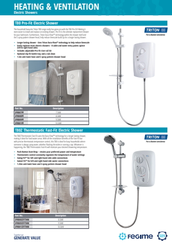 509HEATING & VENTILATIONTogether we GENERATE VALUE%u2022 Longer lasting shower - Uses Triton Dura-Flow%u2122 technology to help reduce limescale %u2022 Easily replaces most electric showers - 8 cable and water entry points apiece (left & right-hand side) %u2022 Includes adjustable Pro-Fit riser rail kit %u2022 Optional clip-fit bottle tray and a rub clean%u2022 1.5m anti-twist hose and 5 spray pattern shower head T80 Pro-Fit Electric ShowerThe household favourite Triton T80 range really has gone pro with the T80 Pro-Fit! Making it even easier to install and replace an existing shower, Pro-Fit is the ultimate replacement shower for your bathroom. Furthermore, Triton Dura-Flow%u2122 technology within the shower itself and the 5 spray pattern shower head, help reduce limescale build up for a longer lasting shower.%u2022 Push-Button Start/Stop %u2013 retains your preferred power and temperature %u2022 Thermostatic control constantly regulates the temperature of water settings %u2022 Swing-Fit%u2122 for left and right-hand side cable connections%u2022 Swivel Fit%u2122 for left and right-hand side water connections %u2022 1.25m anti-twist hose and 5 spray pattern shower head T80Z Thermostatic Fast-Fit Electric ShowerThe T80Z Thermostatic Fast-Fit uses the Dura-Flow%u2122 technology for a longer lasting shower, making it ideal for hard water areas. With all the installation benefi ts of the Fast-Fit but with precise thermostatic temperature control, this T80 is ideal for busy households where someone is always using water, whether fl ushing the toilet or running a tap. Whatever is happening, the T80Z Thermostatic Fast-Fit will maintain your desired showering temperature.Part No. DescriptionSP8007PF 7.5kWSP8008PF 8.5kWSP8009PF 9.5kWSP8001PF 10.5kWPart No. DescriptionSP8008ZFFTHM 8.5kWSP8009ZFFTHM 9.5kWSP8001ZFFTHM 10.5kWElectric Showers