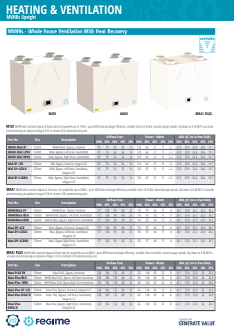 512HEATING & VENTILATIONTogether we GENERATE VALUEMVHRs - Whole House Ventilation With Heat RecoveryMVHRs UprightPart No. Size Description Airfl ow l/sec Power - Watts dBA (@ 3m in free fi eld)100% 80% 60% 40% 20% 100% 80% 60% 40% 20% 100% 80% 60% 40% 20%WHHR Midi BY 125mm WHHR Midi, Bypass, Universal 101 79 58 36 14 120 69 31 11 2.2 33.9 29.9 26.6 24.6 19.7WHHR Midi LBYH 125mm Midi, Bypass, Left Drain, Humidistat 101 79 58 36 14 120 69 31 11 2.2 33.9 29.9 26.6 24.6 19.7WHHR Midi RBYH 125mm Midi, Bypass, Right Drain, Humidistat 101 79 58 36 14 120 69 31 11 2.2 33.9 29.9 26.6 24.6 19.7Midi BY LCD 125mm Midi, Bypass, Universal, Integral LCD 101 79 58 36 14 120 69 31 11 2.2 33.9 29.9 26.6 24.6 19.7Midi BY+LCDLH 125mm Midi, Bypass, Left Drain, Humidistat, Integral LCD101 79 58 36 14 120 69 31 11 2.2 33.9 29.9 26.6 24.6 19.7Midi BY+LCDRH 125mm Midi, Bypass, Right Drain, Humidistat, Integral LCD101 79 58 36 14 120 69 31 11 2.2 33.9 29.9 26.6 24.6 19.7MIDI MVHR with summer bypass & frost-stat, for properties up to 170m2, up to 94% heat exchange effi ciency, variable choice of trickle, boost & purge speeds, sfp down to 0.50 W/l/s accurate commissioning via optional integral LCD or remote LCD commissioning unit.Part No. Size Description Airfl ow l/sec Power - Watts dBA (@ 3m in free fi eld)100% 80% 60% 40% 20% 100% 80% 60% 40% 20% 100% 80% 60% 40% 20%WHHRMaxi BY 150mm WHHR Maxi , Bypass Universal 177 138 99 60 23 176 97 44 17 4 38.1 35.9 33.2 24.2 20.2WHHRMaxi/BLH 150mm WHHR Maxi, Bypass, Left Drain, Humidistat 177 138 99 60 23 176 97 44 17 4 38.1 35.9 33.2 24.2 20.2WHHRMaxi/BRH 150mm WHHR Maxi, Bypass, Right Drain, Humidistat 177 138 99 60 23 176 97 44 17 4 38.1 35.9 33.2 24.2 20.2Maxi BY+LCD 150mm Maxi, Bypass, Universal, Integral LCD 177 138 99 60 23 176 97 44 17 4 38.1 35.9 33.2 24.2 20.2Maxi BY+LCDLH 150mm Maxi, Bypass, Left Drain, Humidistat, Integral LCD177 138 99 60 23 176 97 44 17 4 38.1 35.9 33.2 24.2 20.2Maxi BY+LCDRH 150mm Maxi, Bypass,Right Drain, Humidistat, Integral LCD177 138 99 60 23 176 97 44 17 4 38.1 35.9 33.2 24.2 20.2MAXI MVHR with summer bypass & frost-stat, for properties up to 250m2, up to 92% heat exchange effi ciency, variable choice of trickle, boost & purge speeds, sfp down to 0.40 W/l/s accurate commissioning via optional integral LCD or remote LCD commissioning unit.Part No. Size Description Airfl ow l/sec Power - Watts dBA (@ 3m in free fi eld)100% 80% 60% 40% 20% 100% 80% 60% 40% 20% 100% 80% 60% 40% 20%Maxi PLUS BY 150mm Maxi PLUS, Bypass, Universal 238 186 135 84 35 355 184 85 32 8 43.1 37.4 32.8 26 20.4Maxi Plus/BLH 150mm WHHR Maxi PLUS, Bypass, Left Drain Humidistat 238 186 135 84 35 355 184 85 32 8 43.1 37.4 32.8 26 20.4Maxi Plus /BRH 150mm WHHR Maxi PLUS, Bypass,Right Drain Humidistat 238 186 135 84 35 355 184 85 32 8 43.1 37.4 32.8 26 20.4Maxi Plus BY LCD 150mm Maxi Plus, Bypass, Universal, Integral LCD 238 186 135 84 35 355 184 85 32 8 43.1 37.4 32.8 26 20.4Maxi Plus BLHLCD 150mm Maxi Plus, Bypass, Left Drain, Humidistat, Integral LCD238 186 135 84 35 355 184 85 32 8 43.1 37.4 32.8 26 20.4Maxi Plus BRHLCD150mm Maxi Plus, Bypass, Right Drain, Humidistat, Integral LCD238 186 135 84 35 355 184 85 32 8 43.1 37.4 32.8 26 20.4MAXI PLUS MVHR with summer bypass & frost-stat, for properties up to 400m2, up to 89% heat exchange effi ciency, variable choice of trickle, boost & purge speeds, sfp down to 0.46 W/l/s accurate commissioning via optional integral LCD or remote LCD commissioning unit.MIDI MAXI MAXI PLUS