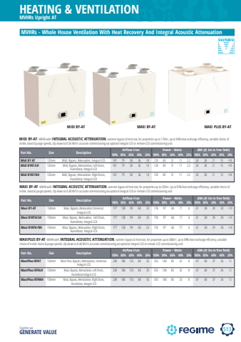 513HEATING & VENTILATIONTogether we GENERATE VALUEMVHRs - Whole House Ventilation With Heat Recovery And Integral Acoustic AttenuationMVHRs Upright ATPart No. Size Description Airfl ow l/sec Power - Watts dBA (@ 3m in free fi eld)100% 80% 60% 40% 20% 100% 80% 60% 40% 20% 100% 80% 60% 40% 20%Midi BY AT 125mm Midi, Bypass, Attenuation, Integral LCD 101 79 58 36 14 120 69 31 11 2.2 34 28 21 15 <10Midi BYAT/LH 125mm Midi, Bypass, Attenulation, Left Drain, Humidistat, Integral LCD101 79 58 36 14 120 69 31 11 2.2 34 28 21 15 <10Midi BYAT/RH 125mm Midi, Bypass, Attenulation, Right Drain, Humidistat, Integral LCD101 79 58 36 14 120 69 31 11 2.2 34 28 21 15 <10MIDI BY-AT- MVHR with INTEGRAL ACOUSTIC ATTENUATION, summer bypass & frost-stat, for properties up to 170m2, up to 94% heat exchange effi ciency, variable choice of trickle, boost & purge speeds, sfp down to 0.50 W/l/s accurate commissioning via optional integral LCD or remote LCD commissioning unit.Part No. Size Description Airfl ow l/sec Power - Watts dBA (@ 3m in free fi eld)100% 80% 60% 40% 20% 100% 80% 60% 40% 20% 100% 80% 60% 40% 20%Maxi BY-AT 150mm Maxi, Bypass, Attenuation Universal, Integral LCD177 138 99 60 23 176 97 44 17 4 41 38 29 20 <10Maxi BYATH/LH 150mm Maxi, Bypass, Attenuation, Left Drain, Humidistat, Integral LCD177 138 99 60 23 176 97 44 17 4 41 38 29 20 <10Maxi BYATH/RH 150mm Maxi, Bypass, Attenuation, Right Drain, Humidistat, Integral LCD177 138 99 60 23 176 97 44 17 4 41 38 29 20 <10MAXI BY-AT- MVHR with INTEGRAL ACOUSTIC ATTENUATION, summer bypass & frost-stat, for properties up to 250m2, up to 92% heat exchange effi ciency, variable choice of trickle, boost & purge speeds, sfp down to 0.40 W/l/s accurate commissioning via optional integral LCD or remote LCD commissioning unitPart No. Size Description Airfl ow l/sec Power - Watts dBA (@ 3m in free fi eld)100% 80% 60% 40% 20% 100% 80% 60% 40% 20% 100% 80% 60% 40% 20%MaxiPlus/BYAT 150mm Maxi Plus, Bypass, Attenuation, Universal, Integral LCD238 186 135 84 35 355 184 85 32 8 47 40 37 26 12MaxiPlus/ATHLH 150mm Maxi, Bypass, Attenulation, Left Drain, Humidistat Integral LCD238 186 135 84 35 355 184 85 32 8 47 40 37 26 12MaxiPlus/ATHRH 150mm Maxi, Bypass, Attenulation, Right Drain, Humidistat, Integral LCD238 186 135 84 35 355 184 85 32 8 47 40 37 26 12MAXIPLUS BY-AT- MVHR with INTEGRAL ACOUSTIC ATTENUATION, summer bypass & frost-stat, for properties up to 400m2, up to 89% heat exchange effi ciency, variable choice of trickle, boost & purge speeds, sfp down to 0.46 W/l/s accurate commissioning via optional integral LCD or remote LCD commissioning unit.MIDI BY-AT MAXI BY-AT MAXI PLUS BY-AT