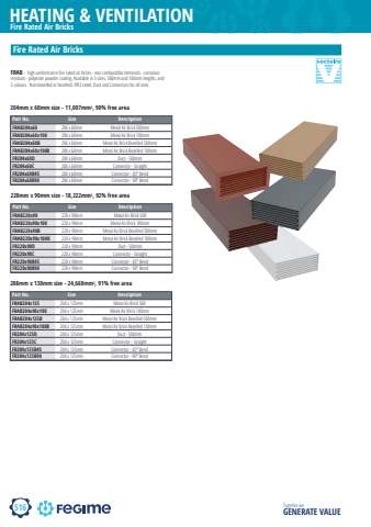 516HEATING & VENTILATIONTogether we GENERATE VALUEFire Rated Air BricksFire Rated Air BricksPart No. Size DescriptionFRAB204x60 204 x 60mm Metal Air Brick 500mmFRAB204x60x100 204 x 60mm Metal Air Brick 100mmFRAB204x60B 204 x 60mm Metal Air Brick Bezelled 500mmFRAB204x60x100B 204 x 60mm Metal Air Brick Bezelled 100mmFR204x60D 204 x 60mm Duct - 500mmFR204x60C 204 x 60mm Connector - StraightFR204x60B45 204 x 60mm Connector - 45%u00ba BendFR204x60B90 204 x 60mm Connector - 90%u00ba BendFRAB - high performance fi re rated air bricks - non combustible terminals - corrosion resistant - polyester powder coating. Available in 3 sizes, 500mm and 100mm lengths, and 5 colours. Non-bezelled or bezelled. IPX3 rated. Duct and Connectors for all sizes.204mm x 60mm size - 11,007mm2, 90% free areaPart No. Size Description FRAB220x90 220 x 90mm Metal Air Brick 500FRAB220x90x100 220 x 90mm Metal Air Brick 100mmFRAB220x90B 220 x 90mm Metal Air Brick Bezelled 500mmFRAB220x90x100B 220 x 90mm Metal Air Brick Bezelled 100mmFR220x90D 220 x 90mm Duct - 500mmFR220x90C 220 x 90mm Connector - StraightFR220x90B45 220 x 90mm Connector - 45%u00ba BendFR220x90B90 220 x 90mm Connector - 90%u00ba Bend220mm x 90mm size - 18,222mm2, 92% free areaPart No. Size Description FRAB204x125 204 x 125mm Metal Air Brick 500FRAB204x90x100 204 x 125mm Metal Air Brick 100mmFRAB204x125B 204 x 125mm Metal Air Brick Bezelled 500mmFRAB204x90x100B 204 x 125mm Metal Air Brick Bezelled 100mmFR204x125D 204 x 125mm Duct - 500mmFR204x125C 204 x 125mm Connector - StraightFR204x125B45 204 x 125mm Connector - 45%u00ba BendFR204x125B90 204 x 125mm Connector - 90%u00ba Bend208mm x 130mm size - 24,660mm2, 91% free area