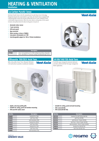 519HEATING & VENTILATIONTogether we GENERATE VALUEVentilationLo-Carbon PureAir SenseSilhouette 100/SELV Axial Fans%u2022 Stylish, ultra low profile grille%u2022 Suitable for ceiling, panel and window mounting%u2022 IPX4 and IPX7 (SELV) ratedVA100/140/150 Axial Fans%u2022 Suitable for ceiling, panel and wall mounting%u2022 IPX4 rated (VA100)%u2022 IP44 rated (VA140/150)Vent-Axia%u2019s PureAir Sense is the UK%u2019s only bathroom fan with Odour Sense Technology. Designed to improve the air we breathe in our homes, the PureAir Sense is equipped with a pioneering odour sensor that increases airfl ow when the air is poor, helping to ensure a comfortable living environment. When the sensor detects a strong odour, the fan speed increases and quickly extracts the odour turning poor air to pure air.With a slim profi le of only 17mm, Silhouette 100 blends in the wall surface to provide an unobtrusive installation.The VA100 range is designed for domestic bathrooms and toilets, whilst the VA140/150 range is designed for kitchen applications.Part No. Description454055 Standard Fan (100)454056 with Timer (100)454057 with Humidistat (100)439974 Standard Fan (SELV)439975 with Timer (SELV)454059 Standard Fan (150)454060 with Timer (150)454061 with Humidistat (150)Part No. Description251110 Standard Fan with Pullcord (VA100)251210 with Timer (VA100)251310 with Pullcord + Shutter (VA100)251410 with Timer + Electric Shutter (VA100)251710 with Humidistat + Electric Shutter (VA100)140120 Standard Fan (VA140/150)140220 with Timer (VA140/150)%u2022 Automatic odour sensor%u2022 7 year warranty%u2022 LED touch panel%u2022 App connected%u2022 Silent running, as low as 19dB(A)%u2022 Low power consumption at 2-5W%u2022 Interchangeable spigots for 100 or 125mm installationsPart No. Description479460 Odour Sensing Bathroom Fan With Intelligent Humidistat, Adjustable Timer, Intermittent or Continuous Settings and Bluetooth App Control