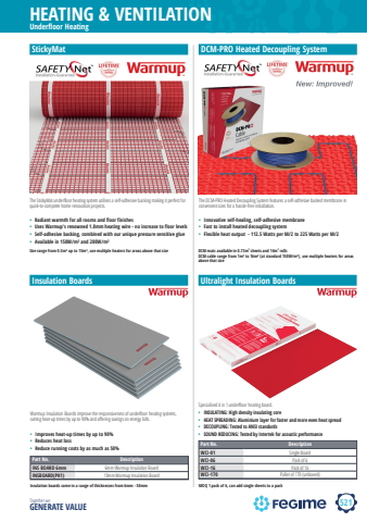 521HEATING & VENTILATIONTogether we GENERATE VALUEsafety netdcm-prowarm up warmupUnderfloor HeatingStickyMatThe StickyMat underfl oor heating system utilises a self-adhesive backing making it perfect for quick-to-complete home renovation projects. Warmup%u00a0Insulation%u00a0Boards improve the responsiveness of underfl oor heating systems, cutting heat-up times by up to 90% and off ering savings on energy bills.%u00a0%u00a0Insulation Boards%u2022 Radiant warmth for all rooms and floor finishes %u2022 Uses Warmup's renowned 1.8mm heating wire - no increase to floor levels %u2022 Self-adhesive backing, combined with our unique pressure sensitive glue%u2022 Available in 150W/m%u00b2 and 200W/m%u00b2%u2022 Improves heat-up times by up to 90% %u2022 Reduces heat loss %u2022 Reduce running costs by as much as 50%DCM-PRO Heated Decoupling SystemThe DCM-PRO Heated Decoupling System features a self-adhesive backed membrane in convenient sizes for a hassle-free installation.%u00a0%u2022 Innovative self-healing, self-adhesive membrane %u2022 Fast to install heated decoupling system %u2022 Flexible heat output - 112.5 Watts per M/2 to 225 Watts per M/2 Part No. DescriptionINS BOARD 6mm 6mm Warmup Insulation BoardINSBOARD(PK1) 10mm Warmup Insulation BoardInsulation boards come in a range of thicknesses from 6mm - 50mmSize range from 0.5m%u00b2 up to 15m%u00b2, use multiple heaters for areas above that size DCM mats available in 0.73m2 sheets and 14m2 rollsDCM cable range from 1m%u00b2 to 16m%u00b2 (at standard 150W/m%u00b2), use multiple heaters for areas above that sizeSpecialised 4 in 1 underfl oor heating board.Ultralight Insulation Boards%u2022 INSULATING: High density insulating core%u2022 HEAT SPREADING: Aluminium layer for faster and more even heat spread%u2022 DECOUPLING: Tested to ANSI standards %u2022 SOUND REDUCING: Tested by Intertek for acoustic performancePart No. DescriptionWCI-01 Single Board WCI-06 Pack of 6WCI-16 Pack of 16WCI-170 Pallet of 170 (unboxed) MOQ 1 pack of 6, can add single sheets to a pack