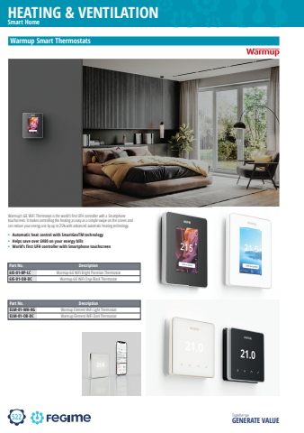 522HEATING & VENTILATIONTogether we GENERATE VALUEWarmup Smart ThermostatsWarmup%u2019s 6iE%u00a0WiFi%u00a0Thermostat is the world%u2019s fi rst UFH controller with a Smartphone touchscreen. It makes controlling the heating as easy as a simple swipe on the screen and can reduce your energy use by up to 25% with advanced automatic heating technology.%u2022 Automatic heat control with SmartGeoTM technology %u2022 Helps save over %u00a3400 on your energy bills %u2022 World%u2019s first UFH controller with Smartphone touchscreen Part No. Description6IE-01-BP-LC Warmup 6iE WiFi Bright Porcelain Thermostat6IE-01-OB-DC Warmup 6iE WiFi Onyx Black ThermostatSmart HomePart No. DescriptionELM-01-WH-RG Warmup Element WiFi Light ThermostatELM-01-OB-DC Warmup Element WiFi Dark Thermostat