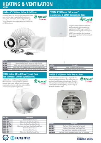 524HEATING & VENTILATIONTogether we GENERATE VALUEMVHRThe DX150 intermittent extract fan range is designed for those looking for something conventional, with a modern twist. These fans control humidity, odours and mould growth eff ectively in kitchens, utility rooms, larger bathrooms and individual offi ces. Suitable for both wall and ceiling fi tting. The DX150 range has two speeds, selectable at install.Part No. DescriptionDX150S Two Speed 150mm Square Axial Fan StandardDX150TS Two Speed 150mm Square Axial Fan with TimerDX150PS Two Speed 150mm Square Axial Fan with PullcordDX150HTS Two Speed 150mm Square Axial Fan with Timer and HumidistatDX150 6%u201d/150mm Axial Extract FansxpelairCF20TX 4%u201d/100mm %u201cAll in one%u201d Intermittent & dMEV Centrifugal FansDesigned to control condensation and odours in toilet, bathroom, utility room and kitchen applications, the CF20TX range is suitable for installations where a longer duct run is required.LVCF20TX comes complete with a transformer for safe fi tting in Splashzone 1 of Bathrooms and Shower Rooms.Part No. DescriptionCF20TX Premier Centrifugal Fan with HumidistatLVCF20TX LoVolt Premier Centrifugal Fan with HumidistatPart No. DescriptionXIMX 100 100mm Inline Mixed Flow FanXIMX 100T 100mm Inline Mixed Flow Fan with TimerXIMX 100 Plus 100mm Inline Extra Power Mixed Flow FanXIMX 100 Plus T 100mm Inline Extra Power Mixed Flow Fan with TimerXIMX 125 125mm Inline Mixed Flow FanXIMX 150 150mm Inline Mixed Flow FanXIMX 150T 150mm Inline Mixed Flow Fan with TimerxpelairXIMX Inline Mixed Flow Extract Fans for Domestic Ducted ApplicationsAvailable in 3 sizes, the XIMX range of plastic inline fans off ers solutions for a wide range of ducted applications. All models have 2 speeds, selectable at install, and come complete with a convenient cradle which makes installation and subsequent inspection straightforward.xpelairAirline 4%u201d/100mm Inline Axial FansDesigned for fi tting in the loft space above a bathroom or shower room, the Airline range is supplied with white and chrome internal grilles, external grille, fl exible ducting and all fi xings.The ALL100 products come complete with a Cool White LED light and SELV transformer.Part No. DescriptionAL100 100mm Inline Duct Fan with Ducting and Grilles 220-240VAL100T 100mm Inline Duct Fan with Timer, Ducting and Grilles 220-240VALL100 100mm Inline Duct Fan with LED Light, Ducting and Grilles 220-240VALL100T 100mm Inline Duct Fan with Timer, LED Light, Ducting and Grilles 220-240V