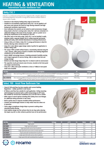 526HEATING & VENTILATIONTogether we GENERATE VALUEgreenwood airvacIntermittent Extract Ventilation FansUnity CV2.1Part No. Description IP VoltageCV2.1 Ultra Low Energy dMEV/Continuously running fan with Greenwood CommissionSMART%u2122 technology and optional SMART Humidity and Timer options set-up at installation IPX4 CeilingIPX5 Wall220%u2013240VCV2.1CTA110 Ultra Low Energy dMEV/Continuously running fan with Greenwood CommissionSMART%u2122 technology and optional SMART Humidity and Timer options set-up at installation (For use with semi-rigid ducting only) IPX4 Ceiling 220%u2013240VSelect 100 - Axial Flow Bathroom FanUnity CV2.1 is a continuously running extract fan, designed to off er a simplistic approach to meet Building Regulations and provide an energy effi cient domestic ventilation solution to improve indoor air quality.%u2022 Extension to the industry leading Unity range of extract fans%u2022 Suitable for all installation applications Unity CV2.1 can be applied to all wet rooms and removes the need for large ducting networks and high background ventilation requirements %u2022 Once calibrated, the controls can be locked to avoid unnecessary changes being made to the fan%u2019s running mode. Unity CV2.1 will also remember it%u2019s calibrated settings in the event of loss of power, such as a power cut or during any maintenance to the property or the unit %u2022 Like other units in the Unity range, Unity CV2.1 can be installed in walls, windows (with a separate adaptor kit) or ceiling mounted and ducted quickly and easily, with minimal disturbances to existing infrastructure %u2022 Using as little as 0.5 Watts, Unity CV2.1%u2019s energy performance is ideal for directly reducing carbon emissions in SAP %u2022 Unity CV2.1 short 68mm spigot design makes it perfect for application in shallow ceiling voids%u2022 The unique 100% variable airflow feature, conveniently achieved using the + and - buttons, offers peace of mind to Installers that Building Regulation compliance can be easily achieved%u2022 Unity%u2019s SMART technology features, including automatic humidity sensing and a logical approach to overrun timing, help to reduce heat loss and energy wastage %u2022 Refined and sleek design helps Unity CV2.1 to blend in with its environment %u2022 The capacitive touch pad ensures ease of access, located on the front panel and simple commissioning %u2022 Unity CV2.1 offers ultra-quiet ventilation as low as 11dB(A) in low-speed mode once installedPart No. Description Voltage IP m3/h l/s Watts dB(A)*AXS100 Single speed 230 X4 72 20 13.2 33AXS100PC Single speed with pullcord 230 X4 72 20 13.2 33AXS100T Single speed with overrun timer & pullcord 230 X4 72 20 13.6 33AXS100TR Single speed with overrun timer & remote operation 230 X4 72 20 13.6 33AXS100HT Single speed with humidistat/timer & pullcord 230 X4 72 20 16.8 33AXS100SVIT Single speed SELV with overrun timer & pullcord 12 X7 72 20 17.8 33AXS100SVIHT Single speed SELV with humidistat/timer & pullcord 12 X7 72 20 17.2 33%u2022 Classic %u00d8 100 axial flow fan that complies with current Building Regulations %u2013 widely specified in new houses%u2022 %u00d8 100mm axial flow fans suitable for wall application. Ceiling mounting with discharge via external wall or soffit incorporating one 90%u00b0 bend. Not suitable for vertical duct installations via a roof tile vent or similar%u2022 Wide range of control options including SELV (Safety Extra Low Voltage) for additional safety protection in wet rooms%u2022 Built in guide vanes to improve installed airflow performance %u2022 Includes anti-backdraught shutters to help reduce heat loss when not in operation%u2022 Clever spigot strengthener design helps to prevent crushing when attaching flexible ducting%u2022 Axial impellor design has flat surfaces that do not clog easily reducing the impact any dirt or other airborne particles have on fan performance