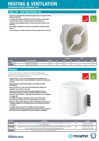 527HEATING & VENTILATIONTogether we GENERATE VALUEIntermittent Extract Ventilation FansSelect 150 - Axial Flow Kitchen FanOmnique%u2022 Suitable for wall installation with built in guide vanes to improve installed airflow performance%u2022 %u00d8 150mm axial impellor design has flat surfaces that do not clog easily reducing impact any dirt or particles have on fan performance%u2022 Includes anti-backdraught shutters to help reduce heat loss when not in operation%u2022 Clever spigot strengtheners to prevent crushing when attaching flexible ducting%u2022 Classic styling for all modern interiors and easy to wipe clean as necessaryOmnique has been designed as a multifunction fan that meets Building Regulation requirements and is also adaptable so that it can be set to meet the individual ventilation requirements of virtually any property or project.%u2022 Using as little as 1.1W in continuous running mode, Omnique costs less than a penny a day to run contributing to a reduction in fuel poverty in homes%u2022 Omnique has been specifically designed to be maintained rather than replaced%u2022 Being a versatile 6-in-1 fan means that Omnique will comply with regulations for any home, every time%u2022 Contractor costs for planned and responsive maintenance can be substantially reduced as Omnique%u2019s multifunctionality is the perfect answer for any installation %u2013 inspection and installation can be completed in a single visit%u2022 The SMART technology in Omnique removes the need for tenant interventionand always ensures the optimal indoor environment%u2022 Omnique%u2019s 100% variable airflow is ideal for installations where there are existing gas appliances as the airflow rates can be reduced and tailored as necessary%u2022 The highly robust window kit for Omnique has been designed in conjunction with the people responsible for advising on secure products in housing and has been awarded the Secured by Design AccreditationNormal SlowPart No. Control Operation Voltage IP m3/h l/s m3/h l/s dB(A)*AXSK Single speed with pullcord 230 X2 250 70 - - 43AXSKMA Single speed with pullcord 230 X2 250 70 133 37 43Part No. Description IP VoltageOF100GIP Multifunctional fan with automatic Greenwood HumidiSMART sensing and Greenwood TimerSMART overrun options (set-up at installation)IPX4 220-240V or 24V DC whenconverted to SELV modeOF100SBD Multifunctional fan with automatic Greenwood HumidiSMART sensing and Greenwood TimerSMART overrun options (set-up at installation) & secure window kit for Omnique low energy multifunction fanIPX4 220-240V or 24V DC whenconverted to SELV modePFAOF100 Picture frame adaptor for Omnique multifunction fan - -