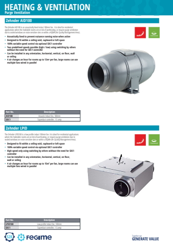 528HEATING & VENTILATIONTogether we GENERATE VALUEPurge VentilationZehnder AID100Part No. DescriptionAID100 Acoustic Induct fan, 100mmSDC1 Superduct controller, 1.5 ampZehnder LPIDThe Zehnder AID100 is an acoustically lined induct 100mm fan. It is ideal for residential applications where the habitable rooms are at risk of overheating, or require purge ventilation due to sealed windows on noise sensitive sites or within a AQMA (Air Quality Management Area).%u2022 Acoustically lined to prevent nuisance running noise when active%u2022 Designed to fit within a ceiling void, cupboard or loft space%u2022 100% variable speed control via optional SDC1 controller%u2022 Two predefined speeds possible (high / low) using switching by others without the need for SDC1 controller%u2022 Can be installed in any orientation, horizontal, vertical, on floor, wall or ceiling%u2022 4 air changes an hour for rooms up to 13m2 per fan, large rooms can use multiple fans wired in parallelThe Zehnder LPID100 is a low profi le induct 100mm fan. It is ideal for residential applications where the habitable rooms are at risk of overheating, or require purge ventilation due to sealed windows on noise sensitive sites or within a AQMA (Air Quality Management Area).%u2022 Designed to fit within a ceiling void, cupboard or loft space%u2022 100% variable speed control via optional SDC1 controller%u2022 High speed only using switching by others without the need for SDC1 controller%u2022 Can be installed in any orientation, horizontal, vertical, on floor, wall or ceiling%u2022 4 air changes an hour for rooms up to 15m2 per fan, large rooms can use multiple fans wired in parallelPart No. DescriptionLPID100 Low profi le Induct fan, 100mmSDC1 Superduct controller, 1.5 amp