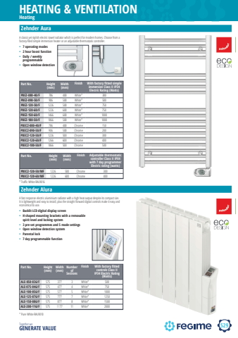 529HEATING & VENTILATIONTogether we GENERATE VALUEZehnder AuraZehnder AluraA classic yet stylish electric towel radiator which is perfect for modern homes. Choose from a factory-fi ted simple immersion heater or an adjustable thermostatic controller.%u2022 7 operating modes%u2022 2 hour boost function%u2022 Daily / weekly programmable%u2022 Open window detectionA fast response electric aluminium radiator with a high heat output despite its compact size. It is lightweight and easy to install, plus the straight forward digital controls make it easy and economical to use.%u2022 Backlit LCD digital display screen%u2022 H shaped mounting brackets with a removable spirit level and locking system%u2022 3 pre-set programmes and 5 mode settings%u2022 Open window detection system%u2022 Parental lock%u2022 7 day programmable functionPart No. Height (mm) Width (mm) Number of Sections Finish With factory fi tted controls Class II IP34 Electric Rating (Watts)ALE-050-036/F 575 377 3 White* 500ALE-075-046/F 575 477 4 White* 750ALE-100-056/F 575 577 5 White* 1000ALE-125-076/F 575 777 7 White* 1250ALE-150-086/F 575 877 8 White* 1500ALE-200-116/F 575 1177 11 White* 2000Heating* Pure White RAL9010Part No. Height (mm) Width (mm) Finish With factory fi tted simple immersion Class II IP34 Electric Rating (Watts)PBEZ-080-40/F 786 400 White* 300PBEZ-090-50/F 906 500 White* 500PBEZ-120-50/F 1226 500 White* 750PBEZ-120-60/F 1226 600 White* 750PBEZ-150-60/F 1466 600 White* 1000PBEZ-180-50/F 1866 500 White* 1000PBECZ-080-40/F 786 400 Chrome 150PBECZ-090-50/F 906 500 Chrome 200PBECZ-120-50/F 1226 500 Chrome 300PBECZ-120-60/F 1266 600 Chrome 400PBECZ-180-50/F 1866 500 Chrome 500* Traffi c White RAL9016Part No. Height (mm) Width (mm) Finish Adjustable thermostatic controller Class II IPX4 with 7 day programmer Electric rating (watts)PBECZ-120-50/MF 1226 500 Chrome 300PBECZ-120-60/MF 1226 600 Chrome 400