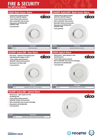 535FIRE & SECURITYTogether we GENERATE VALUEAico 600 Series AlarmsEi630iRF RadioLINK+ Heat Alarm%u2022 Heat sensor - responds to heat build-up from large flaming fires (triggers at 58%u00b0C)%u2022 10 year Lithium battery powered%u2022 RadioLINK+ Wireless interconnection%u2022 Kitemarked to BS 5446-2:2003%u2022 5 year guaranteePart No. DescriptionEi630iRF RadioLINK+ Heat Alarm 10 Year BatteryEi650i Optical Alarm%u2022 Optical sensor - quick response to slow smouldering fires%u2022 10 year Lithium battery powered%u2022 Built in AudioLINK+ data extraction technology%u2022 Kitemarked to BS EN14604:2005%u2022 5 year guaranteeEi650iRF RadioLINK+ Optical Alarm%u2022 Optical sensor - quick response to slow smouldering fires%u2022 10 year Lithium battery powered%u2022 RadioLINK+ Wireless interconnection%u2022 Built in AudioLINK+ data extraction technology%u2022 Kitemarked to BS EN14604:2005%u2022 5 year guaranteePart No. DescriptionEi650i Optical Smoke Alarm 10 Year BatteryPart No. DescriptionEi650iRF RadioLINK+ Optical Smoke Alarm 10 Year BatteryEi660i Multi-Sensor Alarm%u2022 Contains both an Optical and Heat sensor for a total fire response%u2022 10 year Lithium battery powered%u2022 Built in AudioLINK+ data extraction%u2022 Kitemarked to BS EN14604:2005 & BS5446-2:2003%u2022 5 year guaranteePart No. DescriptionEi660i Multi-Sensor AlarmEi660iRF RadioLINK+ Multi-Sensor Alarm%u2022 Contains both an Optical and Heat sensor for a total fire response%u2022 10 year Lithium battery powered%u2022 Built in AudioLINK+ data extraction%u2022 RadioLINK+ Wireless interconnection%u2022 Kitemarked to BS EN14604:2005 & BS5446-2:2003%u2022 5 year guaranteePart No. DescriptionEi660iRF RadioLINK+ Multi-Sensor Alarm