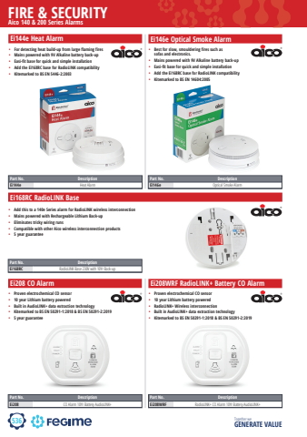 536FIRE & SECURITYTogether we GENERATE VALUEAico 140 & 200 Series AlarmsEi144e Heat Alarm%u2022 For detecting heat build-up from large flaming fires%u2022 Mains powered with 9V Alkaline battery back-up%u2022 Easi-fit base for quick and simple installation%u2022 Add the Ei168RC base for RadioLINK compatibility%u2022 Kitemarked to BS EN 5446-2:2003Part No. DescriptionEi144e Heat AlarmEi146e Optical Smoke Alarm%u2022 Best for slow, smouldering fires such as sofas and electronics.%u2022 Mains powered with 9V Alkaline battery back-up%u2022 Easi-fit base for quick and simple installation%u2022 Add the Ei168RC base for RadioLINK compatibility%u2022 Kitemarked to BS EN 14604:2005Ei168RC RadioLINK BasePart No. DescriptionEi146e Optical Smoke AlarmPart No. DescriptionEi168RC RadioLINK Base 230V with 10Yr Back-upEi208 CO AlarmPart No. DescriptionEi208 CO Alarm 10Yr Battery AudioLINK+Ei208WRF RadioLINK+ Battery CO AlarmPart No. DescriptionEi208WRF RadioLINK+ CO Alarm 10Yr Battery AudioLINK+%u2022 Proven electrochemical CO sensor%u2022 10 year Lithium battery powered%u2022 Built in AudioLINK+ data extraction technology%u2022 Kitemarked to BS EN 50291-1:2018 & BS EN 50291-2:2019%u2022 5 year guarantee%u2022 Proven electrochemical CO sensor%u2022 10 year Lithium battery powered%u2022 RadioLINK+ Wireless interconnection%u2022 Built in AudioLINK+ data extraction technology%u2022 Kitemarked to BS EN 50291-1:2018 & BS EN 50291-2:2019%u2022 Add this to a 140e Series alarm for RadioLINK wireless interconnection%u2022 Mains powered with Rechargeable Lithium Back-up%u2022 Eliminates tricky wiring runs%u2022 Compatible with other Aico wireless interconnection products%u2022 5 year guarantee