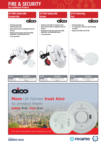 537FIRE & SECURITYTogether we GENERATE VALUEAico Additional ProductsPart No. DescriptionEi170RF RadioLINK Strobe/Pad 230V with Back-up%u2022 Flashing strobe light%u2022 Vibrating pillow pad%u2022 Mains powered with rechargeable lead acid back-up%u2022 Wireless interconnecton with SmartLINK, RadioLINK+ and RadioLINK Alarms%u2022 5 year guaranteeFor more information visit: www.aico.co.ukSafety first. Aico first. More UK homes trust Aicoto protect themFor more information visit: www.aico.co.uk. Ei170RF RadioLINK Strobe/PadPart No. DescriptionEi171RF RadioLINK Strobe 230V with Back-up%u2022 Flashing strobe light for daytime rooms%u2022 Mains powered with rechargeable lead acid back-up%u2022 Wireless interconnecton with SmartLINK, RadioLINK+ and RadioLINK Alarms%u2022 5 year guaranteeEi171RF RadioLINK StrobePart No. DescriptionEi174 Vibrating Pad for Ei170RF& 171RF%u2022 Vibrating pillow pad%u2022 For siting under a pillow to wake sleeping occupants%u2022 Plugs into Ei170RF and Ei171RFEi174 VibratingPad