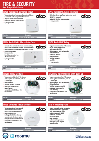 538FIRE & SECURITYTogether we GENERATE VALUEEi408 RadioLINK Switched Input%u2022 Triggers the alarms in a system if an external device is activated, such as a sprinkler flow switch%u2022 10 year Lithium battery powered%u2022 RadioLINK Wireless interconnection%u2022 5 year guaranteeEi413 RadioLINK Panel Interface%u2022 Links Aico alarms to a Panel System (one way)%u2022 12-24V DC powered%u2022 RadioLINK Wireless interconnection%u2022 5 year guaranteePart No. DescriptionEi408 RadioLINK Switched Input 10 Yr BatteryPart No. DescriptionEi413 RadioLINK Panel Interface 12-24VEi414 RadioLINK+ Alarm Interface%u2022 Connects Aico domestic alarms to external devices, such as Telecare/Warden Call and Sprinkler systems%u2022 Mains powered with Rechargeable Lithium Back-up%u2022 RadioLINK+ Wireless interconnection%u2022 Key Switch to control on, off and test status%u2022 5 year guaranteeEi428 RadioLINK Relay%u2022 Triggers external devices if the alarms on the system are activated, such as a strobe light%u2022 Mains powered with Rechargeable Lithium Back-up%u2022 RadioLINK Wireless interconnection%u2022 Volt free contacts, rated 5A%u2022 5 year guaranteePart No. DescriptionEi414 RadioLINK+ Fire/CO Alarm Interface 230VPart No. DescriptionEi428 RadioLINK Relay 5A 230V with Back-upEi128R Relay Module%u2022 Triggers external devices if the alarms on the system are activated, such as a strobe light%u2022 Mains powered%u2022 Volt free contacts, rated 5A%u2022 Additional connectors for ease of wiring%u2022 Compatible with 3000 and 140eSeries alarmsEi128RBU Relay Module with Back-up%u2022 Triggers external devices if the alarms on the system are activated, such as a strobe light%u2022 Mains powered with Rechargeable Lithium Back-up%u2022 Volt free contacts, rated 5A%u2022 Additional connectors for ease of wiring%u2022 Compatible with 3000 and 140e Series%u00a0alarmsPart No. DescriptionEi128R Relay Module 5A Relay 230VPart No. DescriptionEi128RBU Relay Module 5A Relay 230V with Back-upEi129 Switched Input Module%u2022 Triggers the alarms in a system ifan external device is activated,such as a sprinkler flow switch%u2022 Mains powered withRechargeable Lithium Back-up%u2022 Connects with the alarm system through a hard wire interconnect%u2022 Compatible with 3000 and 140e Series%u00a0alarmsEi1516 Masking Plate%u2022 Covers any marks left by rectangular shaped alarms when upgraded to 3000 and 140e Series smoke and heat alarms, Ei168RC RadioLINK bases and Ei128R/Ei128RBU relay modules%u2022 Adhesive strips provided to keep the plate aligned when installingPart No. DescriptionEi129 Switched Input ModulePart No. DescriptionEi1516 Masking plate for Easi-fi t BaseAico Relays & Interfaces