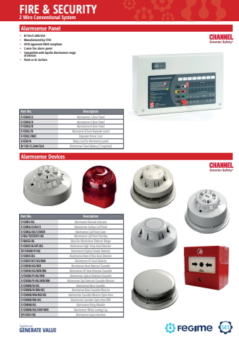 541FIRE & SECURITYTogether we GENERATE VALUEchannel smarter safety2 Wire Conventional SystemAlarmsense PanelAlarmsense DevicesPart No. DescriptionF/CHAS/2 Alarmsense 2-Zone Panel F/CHAS/4 Alarmsense 4-Zone Panel F/CHAS/8 Alarmsense 8-Zone Panel F/CHSC/R Alamsense 8-Zone Repeater panelF/CHSC/RDC Repeater Driver CardS/E20/A Relay Card for Alarmsense panelB/12V/3.2AH/SLA Alarmsense Panel Battery (2 required)Part No. DescriptionF/CHRI/AS Alarmsense Remote IndicatorF/CHBG/S/AS/2 Alarmsense Surface Call PointF/CHBG/AS/COVER Alarmsense Call Point CoverS/BG/TESTKEY/AS Alarmsense Call Point Test KeyF/BASE/AS Base for Alarmsense Detector RangeF/CHHF/A/HT/AS Alarmsense High Temp Heat DetectorSP/CHSM/P/AS Alarmsense Optical Smoke DetectorF/CHHF/AS Alarmsense Rate of Rise Heat DetectorF/CHHF/HT/AS/WB Alarmsense HT Heat DetectorF/CHHR/AS/WB Alarmsense Heat Detector/SounderF/CHHR/AS/WB/BN Alarmsense HT Heat Detector/SounderF/CHSM/P/AS/WB Alarmsense Optical Detector/SounderF/CHSM/P/AS/WB/BN Alarmsense Opt Detector/Sounder/BeaconF/CHWB/D/AS Alarmsense Base SounderF/CHWB/D/BN/AS Alarmsense Base Sounder/BeaconF/CHWB/BN/RD/AS Alarmsense Sounder/Beacon Open AreaF/CHWB/RD/AS Alarmsense Sounder Open Area REDF/CHRM/AS Alarmsense Relay ModuleF/CHWB/AS/CAP/WH Alarmsense White Locking CapSP/CHIF/AS Alarmsense Input Interface%u2022 B/12v/3.2AH/SLA%u2022 Manufactured by CTEC %u2022 LPCB approved EN54 compliant%u2022 2 wire fire alarm panel%u2022 Compatible with Apollo Alarmsense range of devices%u2022 Flush or Or Surface