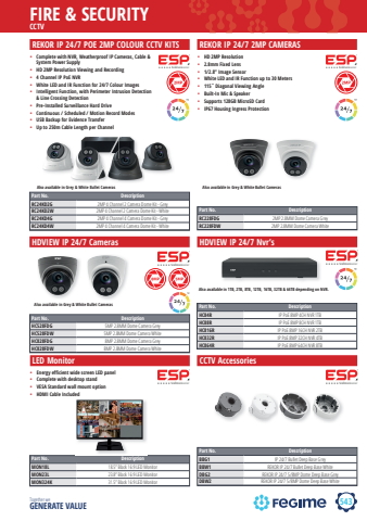 543FIRE & SECURITYTogether we GENERATE VALUEREKOR IP 24/7 POE 2MP COLOUR CCTV KITS%u2022 Complete with NVR, Weatherproof IP Cameras, Cable & System Power Supply%u2022 HD 2MP Resolution Viewing and Recording%u2022 4 Channel IP PoE NVR%u2022 White LED and IR Function for 24/7 Colour Images%u2022 Intelligent Function, with Perimeter Intrusion Detection & Line Crossing Detection%u2022 Pre-Installed Surveillance Hard Drive%u2022 Continuous / Scheduled / Motion Record Modes%u2022 USB Backup for Evidence Transfer%u2022 Up to 250m Cable Length per ChannelPart No. DescriptionRC24KD2G 2MP 4 Channel 2 Camera Dome Kit - GreyRC24KD2W 2MP 4 Channel 2 Camera Dome Kit - WhiteRC24KD4G 2MP 4 Channel 4 Camera Dome Kit - GreyRC24KD4W 2MP 4 Channel 4 Camera Dome Kit - WhitePart No. DescriptionHC528FDG 5MP 2.8MM Dome Camera GreyHC528FDW 5MP 2.8MM Dome Camera White%u00a0HC828FDG 8MP 2.8MM Dome Camera GreyHC828FDW 8MP 2.8MM Dome Camera WhitePart No. DescriptionBBG1 IP 24/7 Bullet Deep Base GreyBBW1 REKOR IP 24/7 Bullet Deep Base WhiteDBG2 REKOR IP 24/7 5/8MP Dome Deep Base GreyDBW2 REKOR IP 24/7 5/8MP Dome Deep Base WhitePart No. DescriptionMON18L 18.5%u201d Black 16:9 LED MonitorMON23L 23.8%u201d Black 16:9 LED MonitorMON324K 31.5%u201d Black 16:9 LED MonitorPart No. DescriptionHC84R IP PoE 8MP 4CH NVR 1TBHC88R IP PoE 8MP 8CH NVR 1TBHC816R IP PoE 8MP 16CH NVR 2TBHC832R IP PoE 8MP 32CH NVR 4TBHC864R IP PoE 8MP 64CH NVR 8TBPart No. DescriptionRC228FDG 2MP 2.8MM Dome Camera GreyRC228FDW 2MP 2.8MM Dome Camera WhiteAlso available in Grey & White Bullet Cameras Also available in Grey & White Bullet CamerasREKOR IP 24/7 2MP CAMERAS %u2022 HD 2MP Resolution%u2022 2.8mm Fixed Lens%u2022 1/2.8%u201d Image Sensor%u2022 White LED and IR Function up to 30 Meters%u2022 115%u02da Diagonal Viewing Angle%u2022 Built-In Mic & Speaker%u2022 Supports 128GB MicroSD Card%u2022 IP67 Housing Ingress ProtectionHDVIEW IP 24/7 Cameras Also available in Grey & White Bullet CamerasHDVIEW IP 24/7 Nvr%u2019sAlso available in 1TB, 2TB, 8TB, 12TB, 16TB, 32TB & 64TB depending on NVR.LED Monitor%u2022 Energy efficient wide screen LED panel%u2022 Complete with desktop stand%u2022 VESA Standard wall mount option%u2022 HDMI Cable IncludedCCTV AccessoriesCCTV